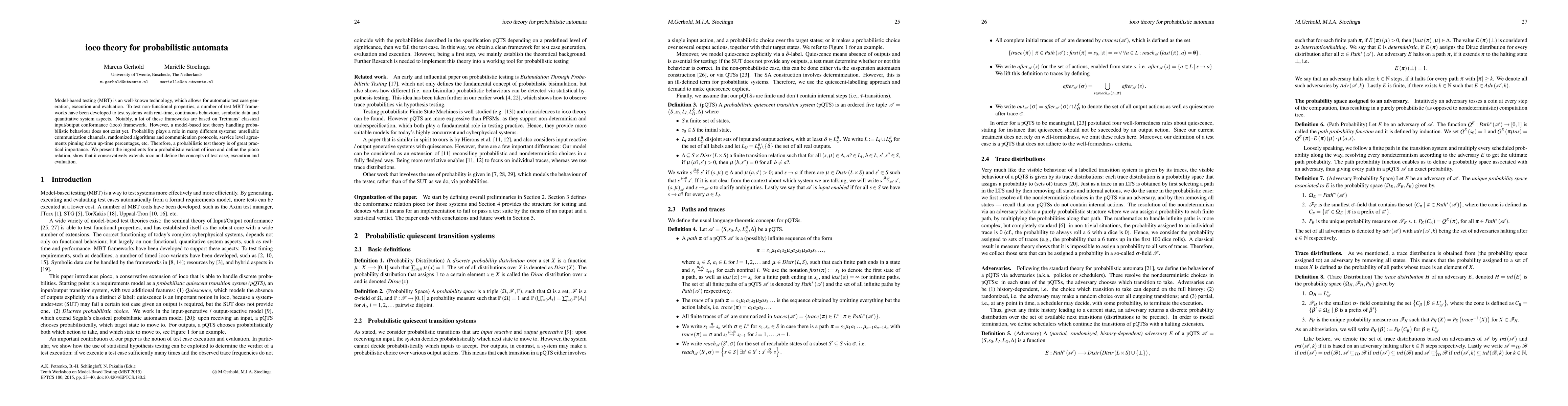 Model-based testing (MBT) is a well-known technology, which allows for automatic test case generation, execution and evaluation. To test non-functional properties, a number of test MBT frameworks have been developed to test systems with real-time, continuous behaviour, symbolic data and quantitative system aspects. Notably, a lot of these frameworks are based on Tretmans' classical input/output conformance (ioco) framework. However, a model-based test theory handling probabilistic behaviour does not exist yet. Probability plays a role in many different systems: unreliable communication channels, randomized algorithms and communication protocols, service level agreements pinning down up-time percentages, etc. Therefore, a probabilistic test theory is of great practical importance. We present the ingredients for a probabilistic variant of ioco and define the {\pi}oco relation, show that it conservatively extends ioco and define the concepts of test case, execution and evaluation.