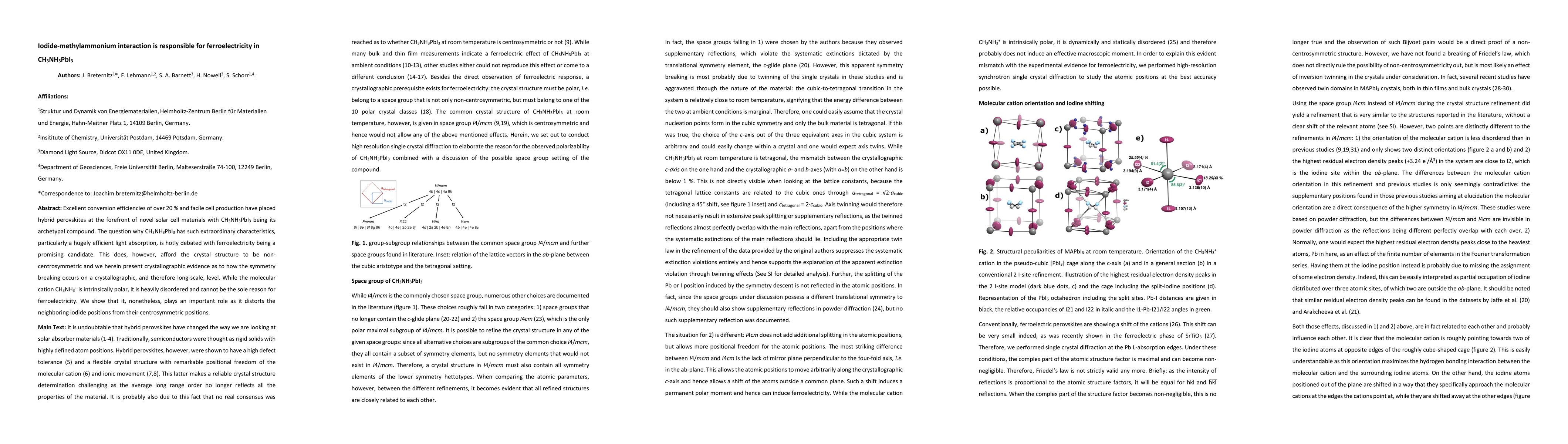The paper presents crystallographic evidence showing that iodide-methylammonium interaction, rather than just the inherently polar methylammonium cation, is responsible for ferroelectricity in CH3NH3PbI3, a key compound in high-efficiency solar cells. The study reveals that the disordered methylammonium cation distorts neighboring iodide positions, breaking crystal symmetry and enabling non-centrosymmetric structure, crucial for the material's exceptional light absorption and performance.