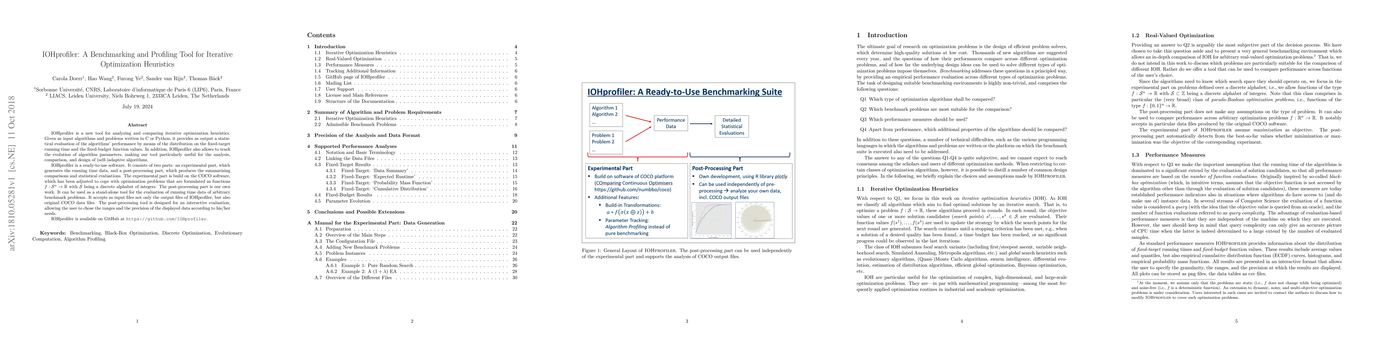 IOHprofiler is a benchmarking and profiling tool for iterative optimization heuristics, offering statistical evaluations of algorithm performance based on running time and fixed-budget function values. It is built on COCO and includes experimental and post-processing components for comprehensive analysis and comparison of optimization algorithms.