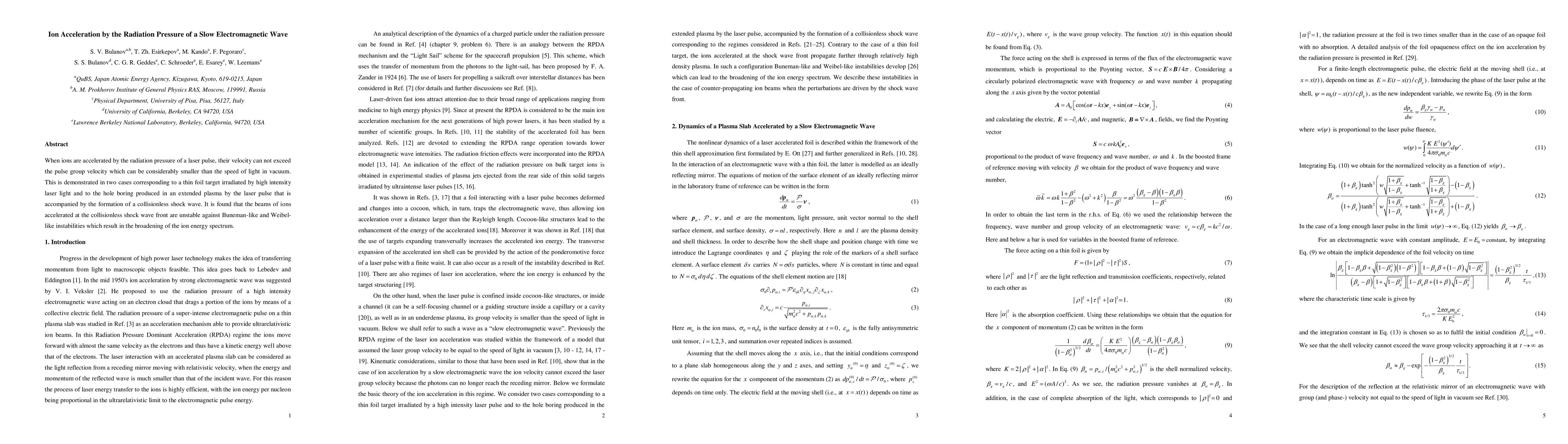 When the ions are accelerated by the radiation pressure of the laser pulse, their velocity can not exceed the laser group velocity, in the case when it is less than the speed of light in vacuum. This is demonstrated in two cases corresponding to the thin foil target irradiated by a high intensity laser light and to the hole boring by the laser pulse in the extended plasma accompanied by the collisionless shock wave formation. It is found that the beams of accelerated at the collisionless shock wave front ions are unstable against the Buneman-lke and the Weibel-like instabilities which result in the ion energy spectrum broadening.
