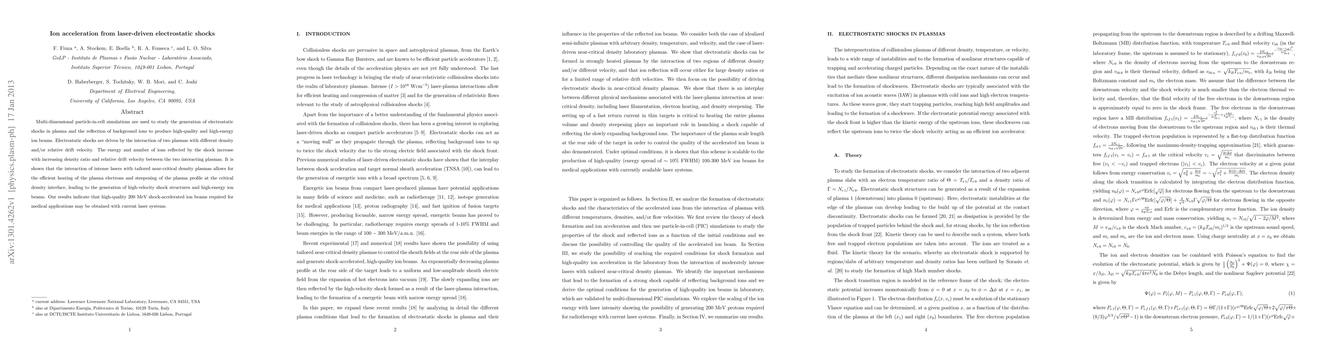 This paper investigates the generation of electrostatic shocks in plasma through laser-driven interactions, leading to high-energy ion beam acceleration. The study finds that shocks formed by plasmas with different densities and drift velocities can reflect background ions efficiently, producing 200 MeV ion beams suitable for medical applications.
