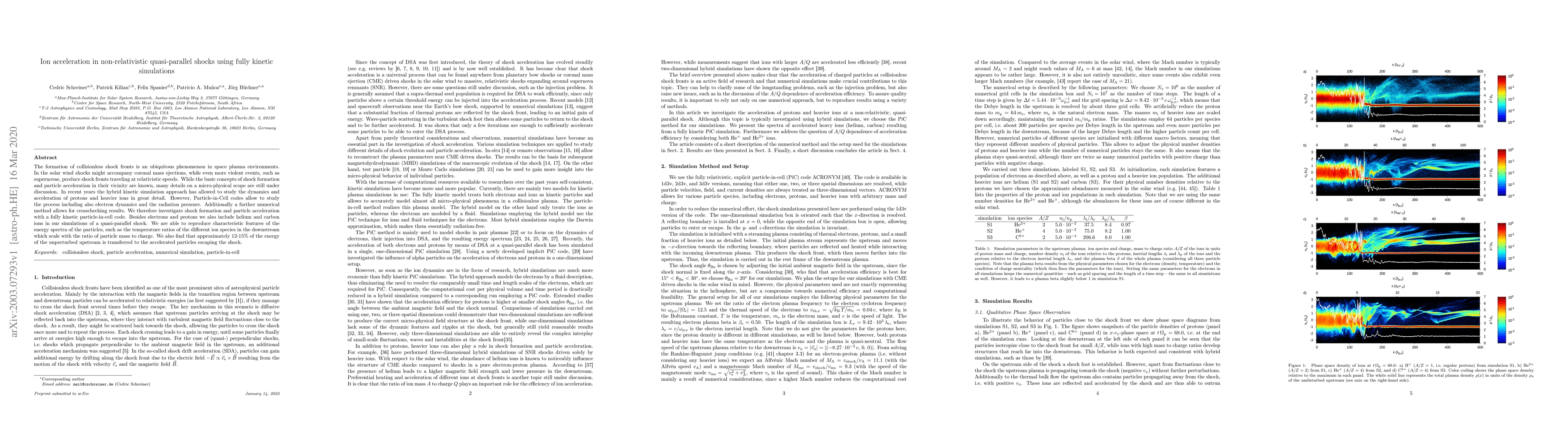 Researchers used a fully kinetic particle-in-cell simulation to study ion acceleration in quasi-parallel shocks, finding that 12-15% of the upstream energy is transferred to accelerated particles.