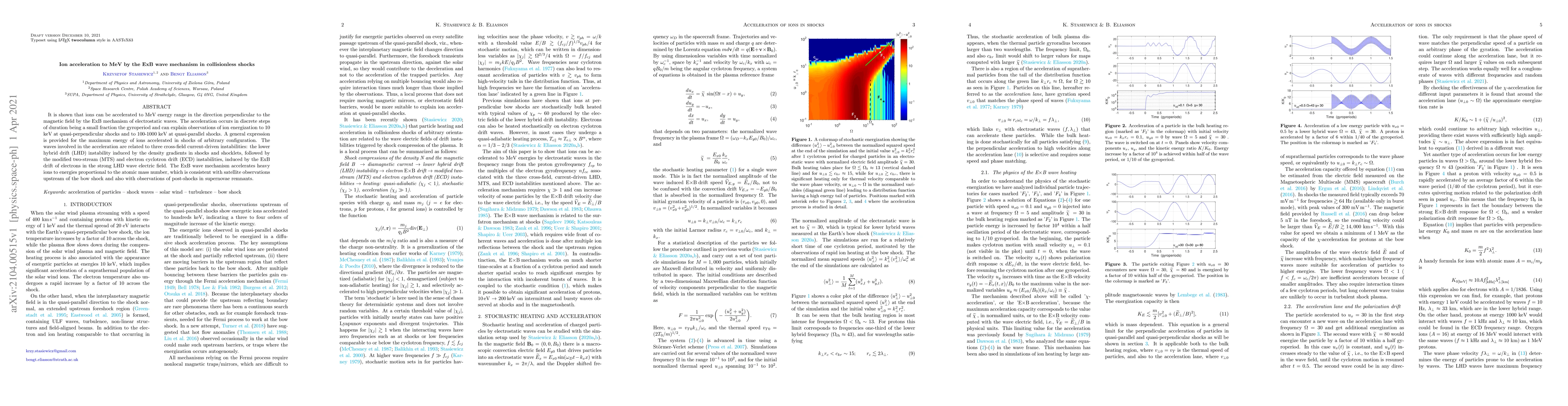 It is shown that ions can be accelerated to MeV energy range in the direction perpendicular to the magnetic field by the ExB mechanism of electrostatic waves. The acceleration occurs in discrete steps of duration being a small fraction the gyroperiod and can explain observations of ion energization to 10 keV at quasi-perpendicular shocks and to 100-1000 keV at quasi-parallel shocks. A general expression is provided for the maximum energy of ions accelerated in shocks of arbitrary configuration. The waves involved in the acceleration are related to three cross-field current-driven instabilities: the lower hybrid drift (LHD) instability induced by the density gradients in shocks and shocklets, followed by the modified two-stream (MTS) and electron cyclotron drift (ECD) instabilities, induced by the ExB drift of electrons in the strong LHD wave electric field. The ExB wave mechanism accelerates heavy ions to energies proportional to the atomic mass number, which is consistent with satellite observations upstream of the bow shock and also with observations of post-shocks in supernovae remnants.