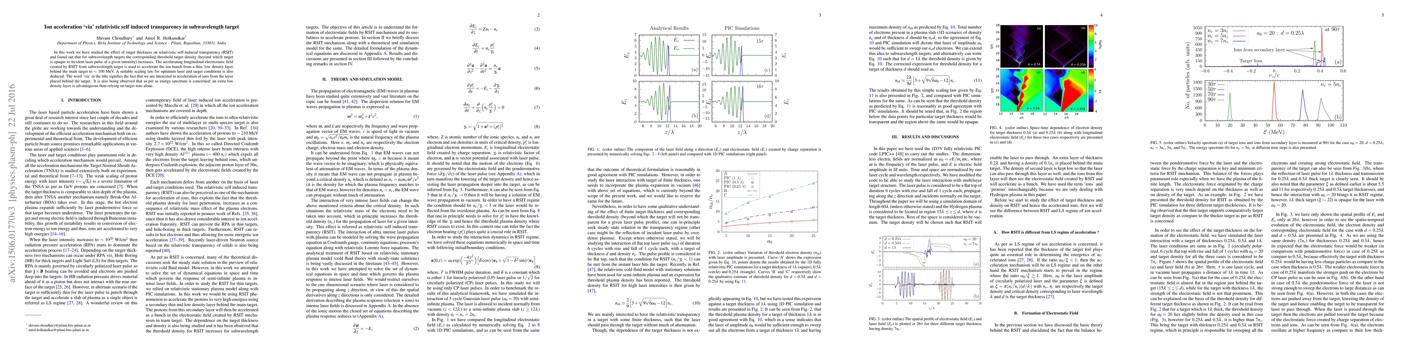 This paper investigates the impact of subwavelength target thickness on relativistic self-induced transparency (RSIT), revealing an increased threshold density for opacity. RSIT-generated fields accelerate ions from a thin, low-density layer behind the main target to approximately 100 MeV, with an optimal scaling law for laser and target conditions deduced.