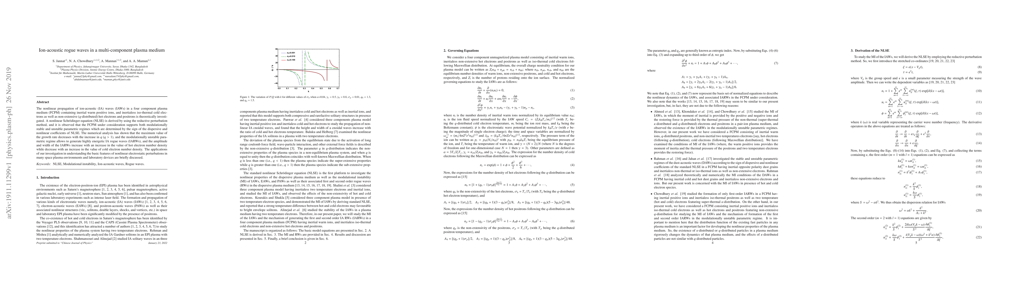 The nonlinear propagation of ion-acoustic (IA) waves (IAWs) in a four component plasma medium (FCPM) containing inertial warm positive ions, and inertialess iso-thermal cold electrons as well as non-extensive ($q$-distributed) hot electrons and positrons is theoretically investigated. A nonlinear Schr\"{o}dinger equation (NLSE) is derived by using the reductive perturbation method, and it is observed that the FCPM under consideration supports both modulationally stable and unstable parametric regimes which are determined by the sign of the dispersive and nonlinear coefficients of NLSE. The numerical analysis has shown that the maximum value of the growth rate decreases with the increase in $q$ ($q>1$), and the modulationally unstable parametric regime allows to generate highly energetic IA rogue waves (IARWs), and the amplitude and width of the IARWs increase with an increase in the value of hot electron number density while decrease with an increase in the value of cold electron number density. The applications of our investigation in understanding the basic features of nonlinear electrostatic perturbations in many space plasma environments and laboratory devices are briefly discussed.