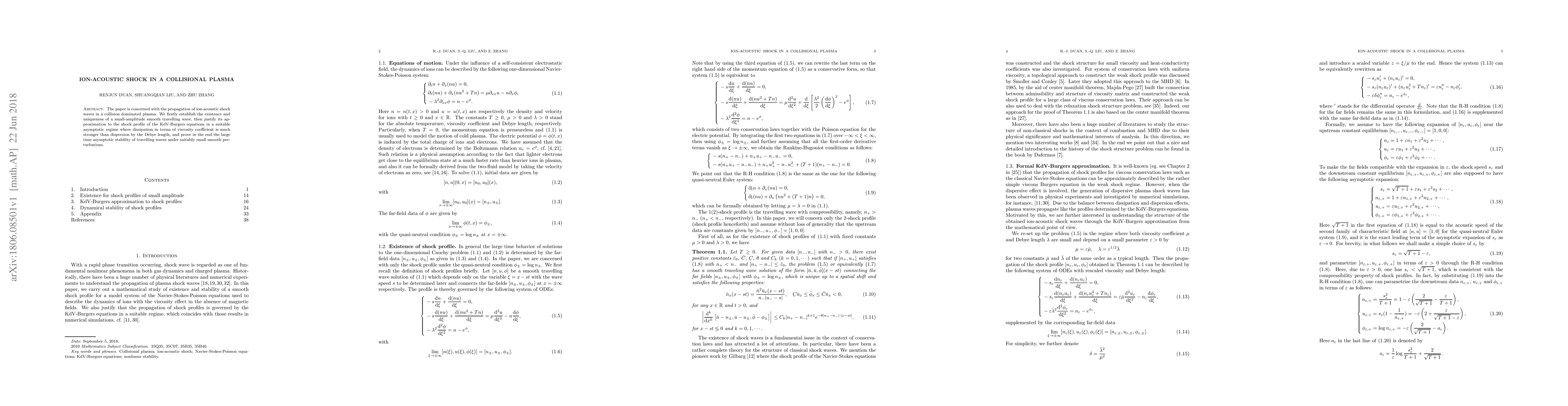 The paper is concerned with the propagation of ion-acoustic shock waves in a collision dominated plasma. We firstly establish the existence and uniqueness of a small-amplitude smooth travelling wave, then justify its approximation to the shock profile of the KdV-Burgers equations in a suitable asymptotic regime where dissipation in terms of viscosity coefficient is much stronger than dispersion by the Debye length, and prove in the end the large time asymptotic stability of travelling waves under suitably small smooth perturbations.