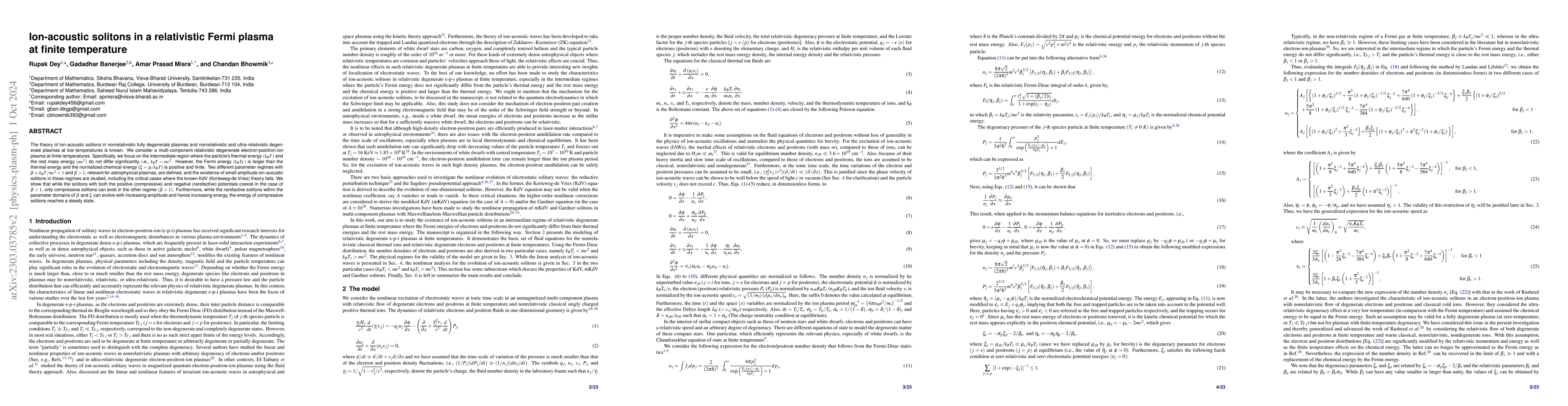 This paper investigates ion-acoustic solitons in relativistic Fermi plasmas at finite temperatures, focusing on regimes where the Fermi energy slightly exceeds thermal and rest mass energies. It reveals the existence of both compressive and rarefactive solitons in the $\beta<1$ regime, while only compressive solitons exist in $\beta>1$, with the latter reaching a steady energy state.