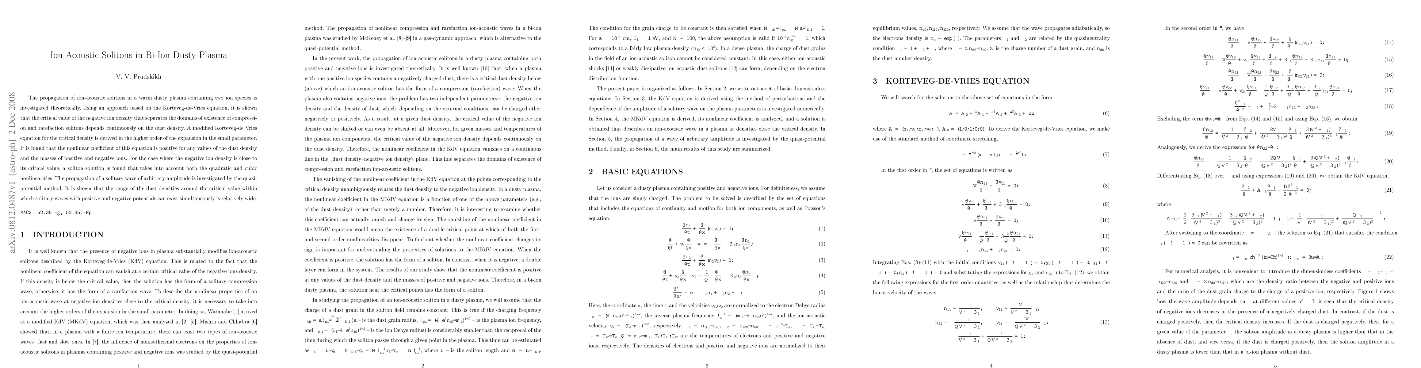 This paper investigates ion-acoustic solitons in bi-ion dusty plasmas, deriving a modified Korteweg-de-Vries equation to show that the critical negative ion density for soliton existence varies with dust density, and finds that solitary waves with positive and negative potentials can coexist over a wide range of dust densities.