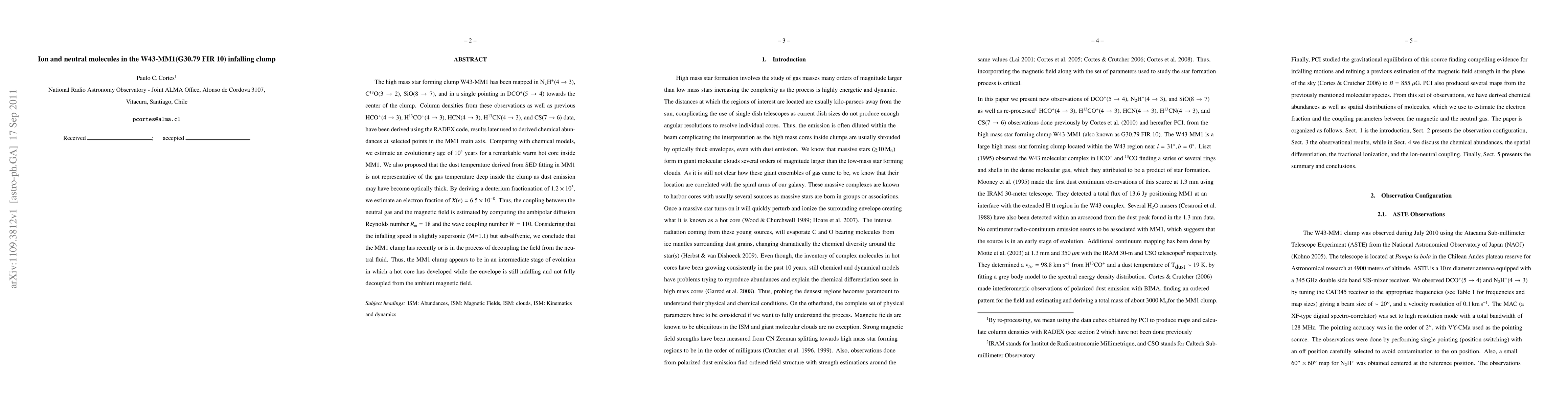 The high mass star forming clump W43-MM1 has been mapped in N$_{2}$H$^{+}(4 \rightarrow 3)$, C$^{18}$O$(3 \rightarrow 2)$, SiO$(8 \rightarrow 7)$, and in a single pointing in DCO$^{+}(5 \rightarrow 4)$ towards the center of the clump. Column densities from these observations as well as previous HCO$^{+}(4 \rightarrow 3)$, H$^{13}$CO$^{+}(4 \rightarrow 3)$, HCN$(4 \rightarrow 3)$, H$^{13}$CN$(4 \rightarrow 3)$, and CS$(7 \rightarrow 6)$ data, have been derived using the RADEX code, results later used to derived chemical abundances at selected points in the MM1 main axis. Comparing with chemical models, we estimate an evolutionary age of $10^{4}$ years for a remarkable warm hot core inside MM1. We also proposed that the dust temperature derived from SED fitting in MM1 is not representative of the gas temperature deep inside the clump as dust emission may have become optically thick. By deriving a deuterium fractionation of $1.2 \times 10^{3}$, we estimate an electron fraction of $X(e)= 6.5 \times 10^{-8}$. Thus, the coupling between the neutral gas and the magnetic field is estimated by computing the ambipolar diffusion Reynolds number $R_{m}=18$ and the wave coupling number W=110. Considering that the infalling speed is slightly supersonic (M=1.1) but sub-alfvenic, we conclude that the MM1 clump has recently or is in the process of decoupling the field from the neutral fluid. Thus, the MM1 clump appears to be in an intermediate stage of evolution in which a hot core has developed while the envelope is still infalling and not fully decoupled from the ambient magnetic field.