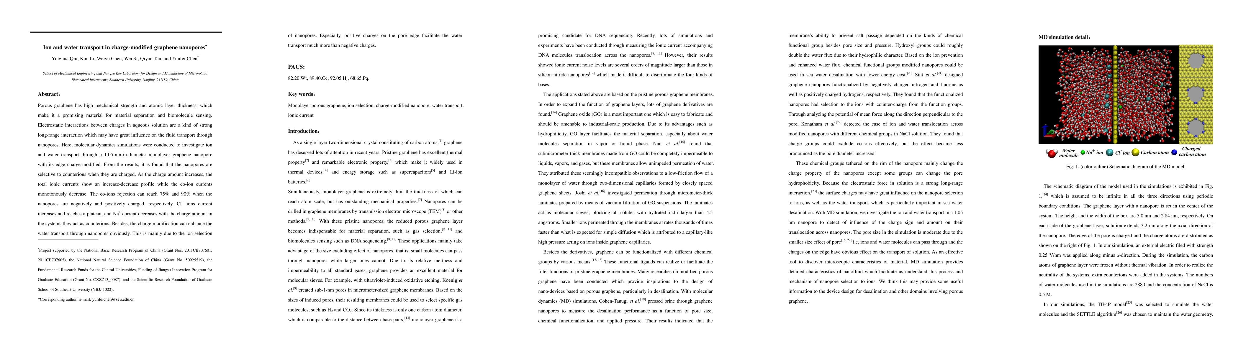 This research investigates how charge modifications on graphene nanopores influence ion and water transport via molecular dynamics simulations. The study finds that charged nanopores exhibit selectivity towards counterions, with increased charges causing an increase-decrease profile in ionic currents and up to 90% co-ion rejection. Positive charges notably enhance water transport through the pores more than negative charges.
