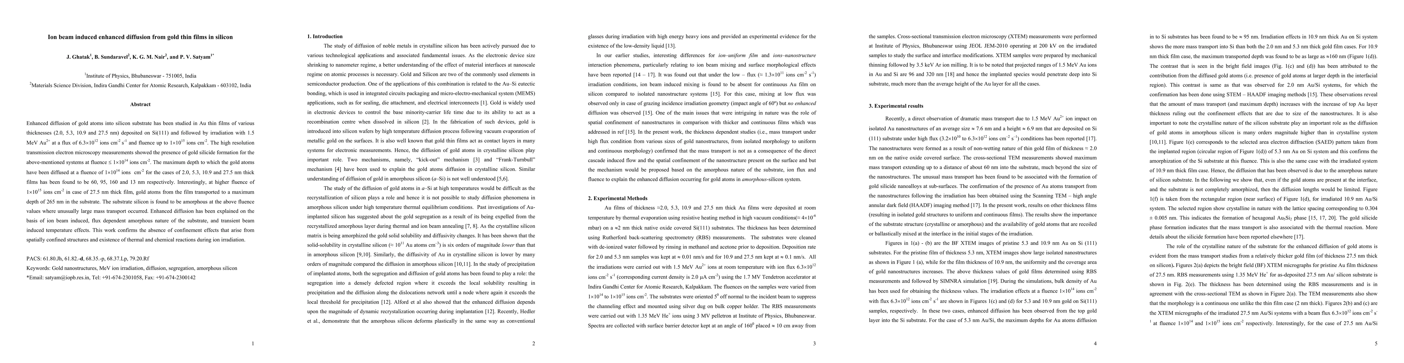 This study investigates the enhanced diffusion of gold atoms into silicon substrates following irradiation with 1.5 MeV Au2+ ions, revealing significant depth penetration and silicide formation in Au thin films of varying thicknesses. At higher fluences, gold atoms diffuse much deeper into the substrate, transforming it into an amorphous state, confirming the role of ion beam-induced mechanisms in the process.