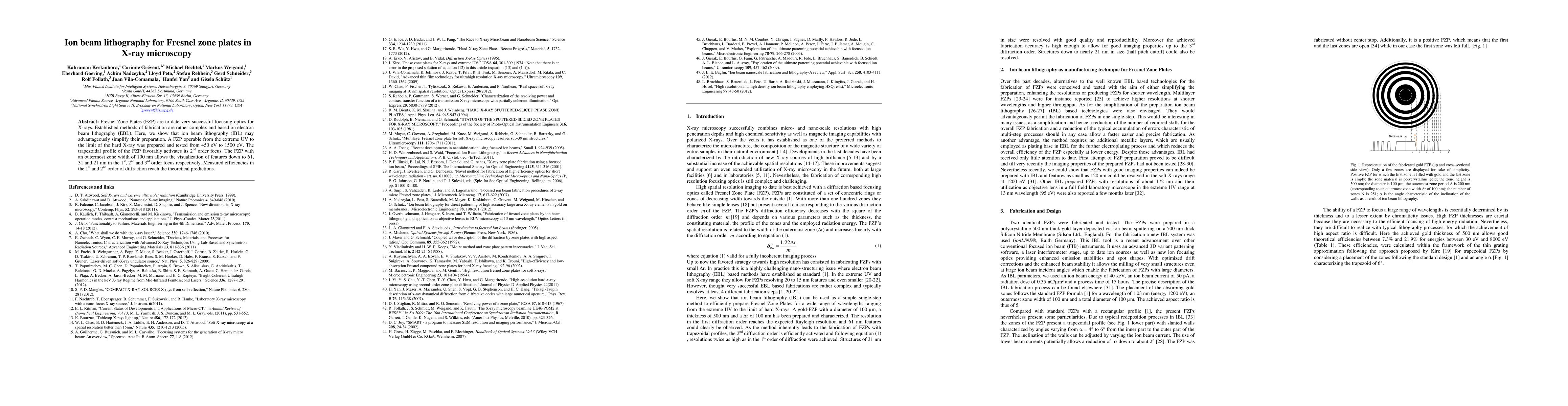 This paper demonstrates that ion beam lithography (IBL) can simplify the fabrication of Fresnel Zone Plates (FZP) for X-ray microscopy, achieving high efficiency and resolution comparable to electron beam lithography (EBL). The study shows successful preparation and testing of an FZP from 450 eV to 1500 eV, enabling visualization of features down to 21 nm.