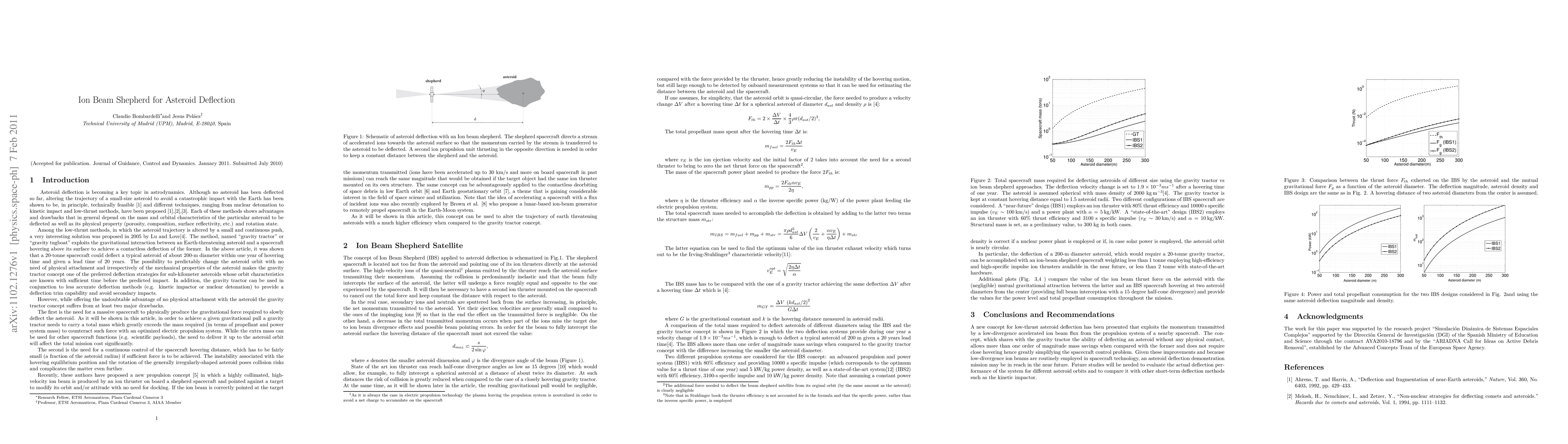This paper proposes an ion beam shepherd method for deflecting Earth-threatening asteroids using a hovering spacecraft equipped with an ion thruster to direct quasi-neutral plasma against the asteroid surface, enabling deflection without physical attachment. This method could enable low-cost asteroid deflection missions.