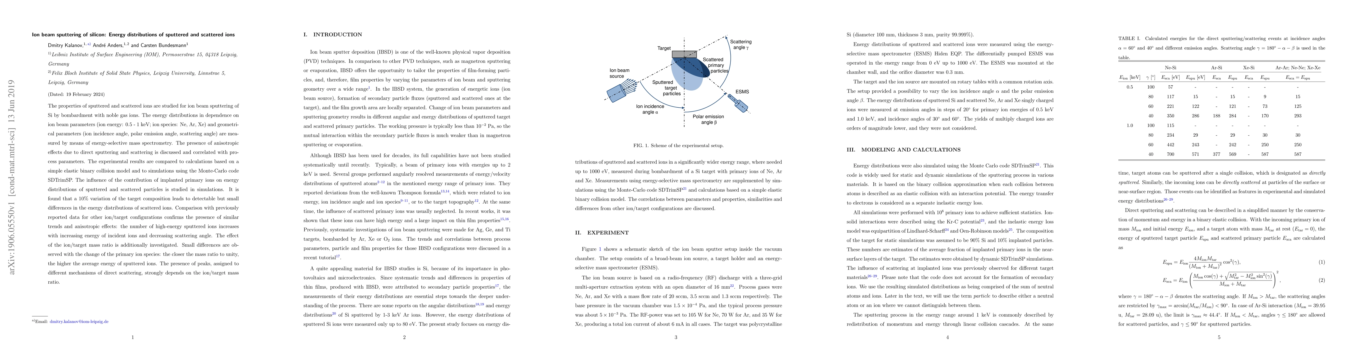This study investigates the energy distributions of sputtered and scattered ions from silicon under noble gas ion bombardment, analyzing effects of ion beam and geometrical parameters. Results show anisotropic effects and confirm trends in high-energy ion sputtering, with mass ratio influencing average sputtered ion energy and scattering mechanisms.