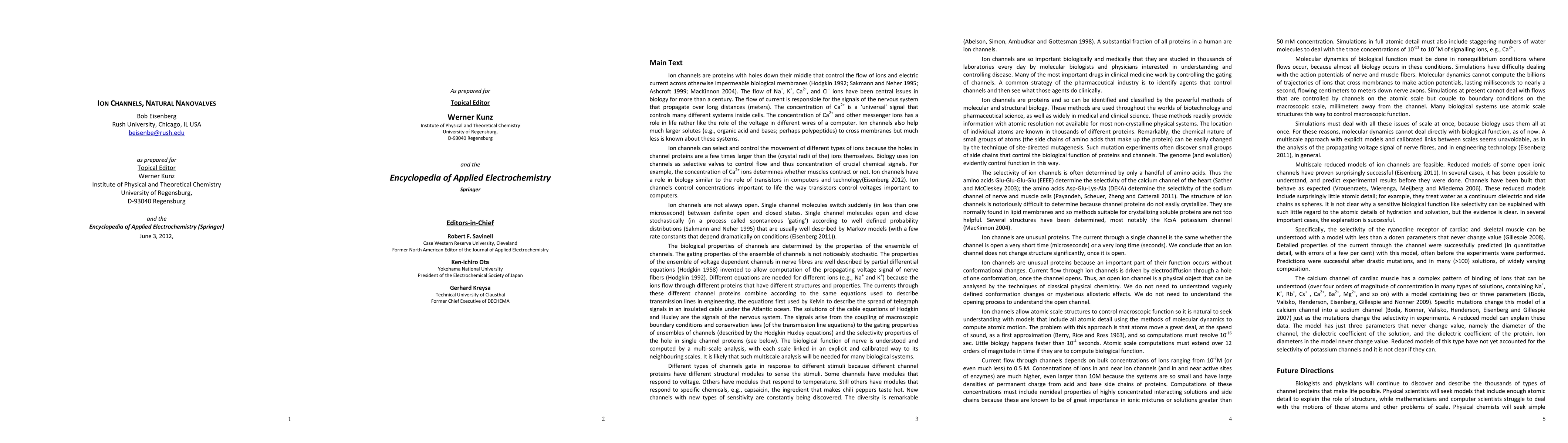 Ion channels are proteins with holes down their middle that control the flow of ions and electric current across otherwise impermeable biological membranes. The flow of sodium, potassium, calcium (divalent), and chloride ions have been central issues in biology for more than a century. The flow of current is responsible for the signals of the nervous system that propagate over long distances (meters). The concentration of divalent calcium ions is a 'universal' signal that controls many different systems inside cells. The concentration of divalent calcium and other messenger ions has a role in life rather like the role of the voltage in different wires of a computer. Ion channels also help much larger solutes (e.g., organic acid and bases; perhaps polypeptides) to cross membranes but much less is known about these systems. Ion channels can select and control the movement of different types of ions because the holes in channel proteins are a few times larger than the (crystal radii of the) ions themselves. Biology uses ion channels as selective valves to control flow and thus concentration of crucial chemical signals. For example, the concentration of divalent calcium ions determines whether muscles contract or not. Ion channels have a role in biology similar to the role of transistors in computers and technology. Ion Channels Control Concentrations Important To Life The Way Computers Control Voltages Important To Computers.