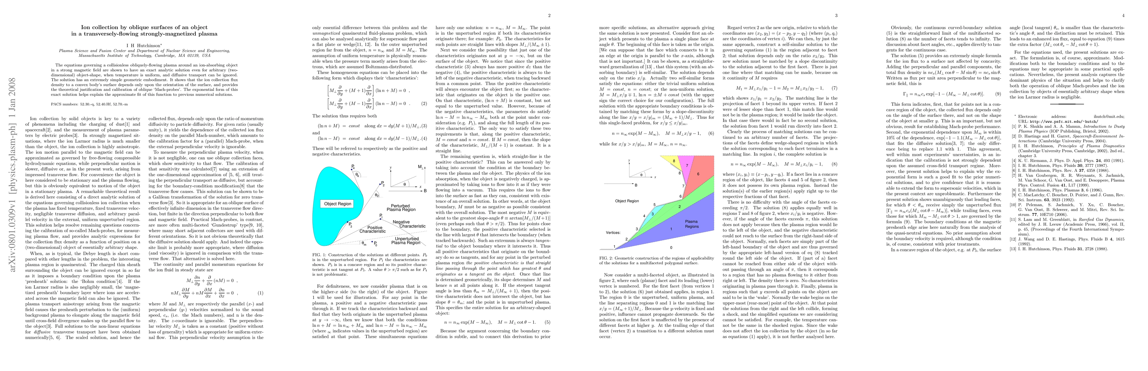 The equations governing a collisionless obliquely-flowing plasma around an ion-absorbing object in a strong magnetic field are shown to have an exact analytic solution even for arbitrary (two-dimensional) object-shape, when temperature is uniform, and diffusive transport can be ignored. The solution has an extremely simple geometric embodiment. It shows that the ion collection flux density to a convex body's surface depends only upon the orientation of the surface, and provides the theoretical justification and calibration of oblique `Mach-probes'. The exponential form of this exact solution helps explain the approximate fit of this function to previous numerical solutions.