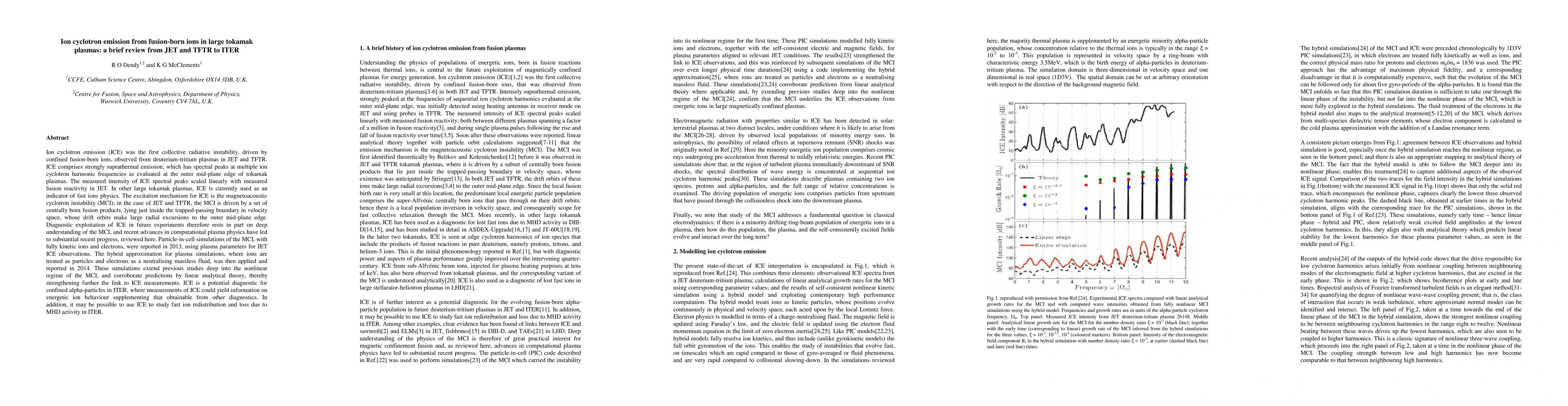 Ion cyclotron emission (ICE) was the first collective radiative instability, driven by confined fusion-born ions, observed from deuterium-tritium plasmas in JET and TFTR. ICE comprises strongly suprathermal emission, which has spectral peaks at multiple ion cyclotron harmonic frequencies as evaluated at the outer mid-plane edge of tokamak plasmas. The measured intensity of ICE spectral peaks scaled linearly with measured fusion reactivity in JET. In other large tokamak plasmas, ICE is currently used as an indicator of fast ions physics. The excitation mechanism for ICE is the magnetoacoustic cyclotron instability (MCI); in the case of JET and TFTR, the MCI is driven by a set of centrally born fusion products, lying just inside the trapped-passing boundary in velocity space, whose drift orbits make large radial excursions to the outer mid-plane edge. Diagnostic exploitation of ICE in future experiments therefore rests in part on deep understanding of the MCI, and recent advances in computational plasma physics have led to substantial recent progress, reviewed here.