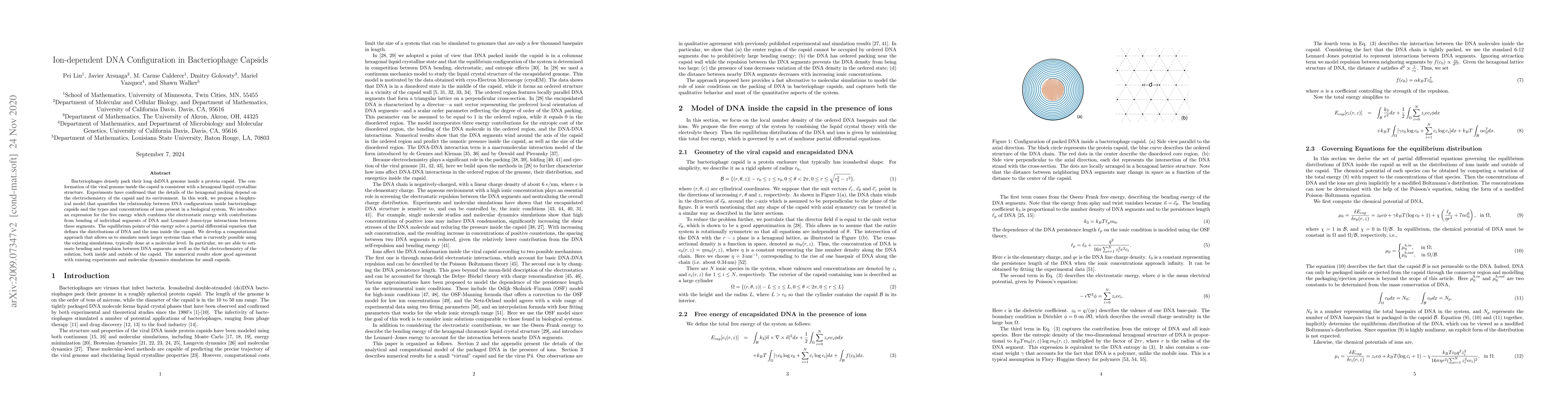 Researchers developed a biophysical model to quantify the relationship between DNA configurations in bacteriophage capsids and ion concentrations in biological systems. The model uses a free energy expression that combines electrostatic energy with DNA bending and Lennard-Jones interactions, allowing for simulations of larger systems than previous methods.