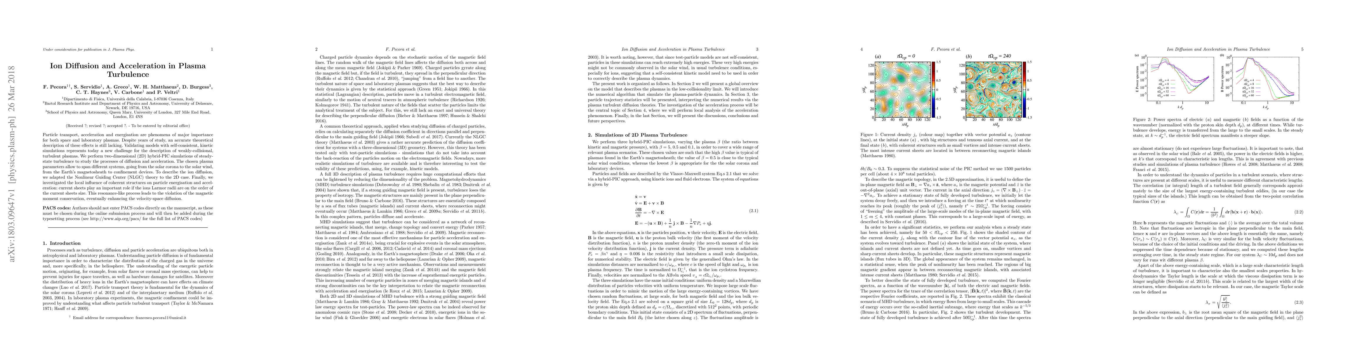 Particle transport, acceleration and energisation are phenomena of major importance for both space and laboratory plasmas. Despite years of study, an accurate theoretical description of these effects is still lacking. Validating models with self-consistent, kinetic simulations represents today a new challenge for the description of weakly-collisional, turbulent plasmas. We perform two-dimensional (2D) hybrid-PIC simulations of steady-state turbulence to study the processes of diffusion and acceleration. The chosen plasma parameters allow to span different systems, going from the solar corona to the solar wind, from the Earth's magnetosheath to confinement devices. To describe the ion diffusion, we adapted the Nonlinear Guiding Center (NLGC) theory to the 2D case. Finally, we investigated the local influence of coherent structures on particle energisation and acceleration: current sheets play an important role if the ions Larmor radii are on the order of the current sheets size. This resonance-like process leads to the violation of the magnetic moment conservation, eventually enhancing the velocity-space diffusion.