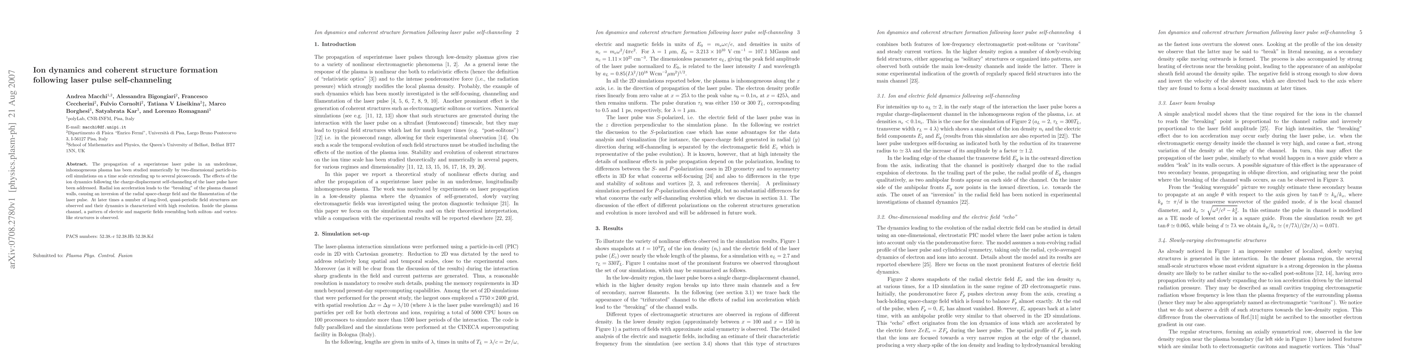 The propagation of a superintense laser pulse in an underdense, inhomogeneous plasma has been studied numerically by two-dimensional particle-in-cell simulations on a time scale extending up to several picoseconds. The effects of the ion dynamics following the charge-displacement self-channeling of the laser pulse have been addressed. Radial ion acceleration leads to the ``breaking'' of the plasma channel walls, causing an inversion of the radial space-charge field and the filamentation of the laser pulse. At later times a number of long-lived, quasi-periodic field structures are observed and their dynamics is characterized with high resolution. Inside the plasma channel, a pattern of electric and magnetic fields resembling both soliton- and vortex-like structures is observed.
