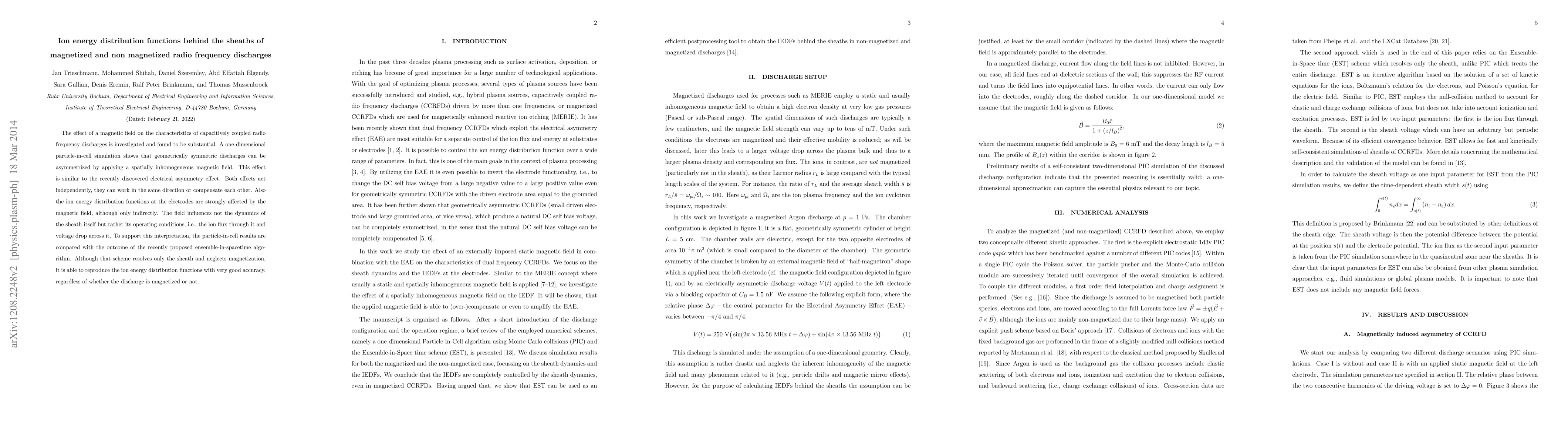 A magnetic field significantly affects radio frequency discharges, causing asymmetry in ion energy distribution functions at electrodes. The field influences operating conditions without altering the sheath dynamics.