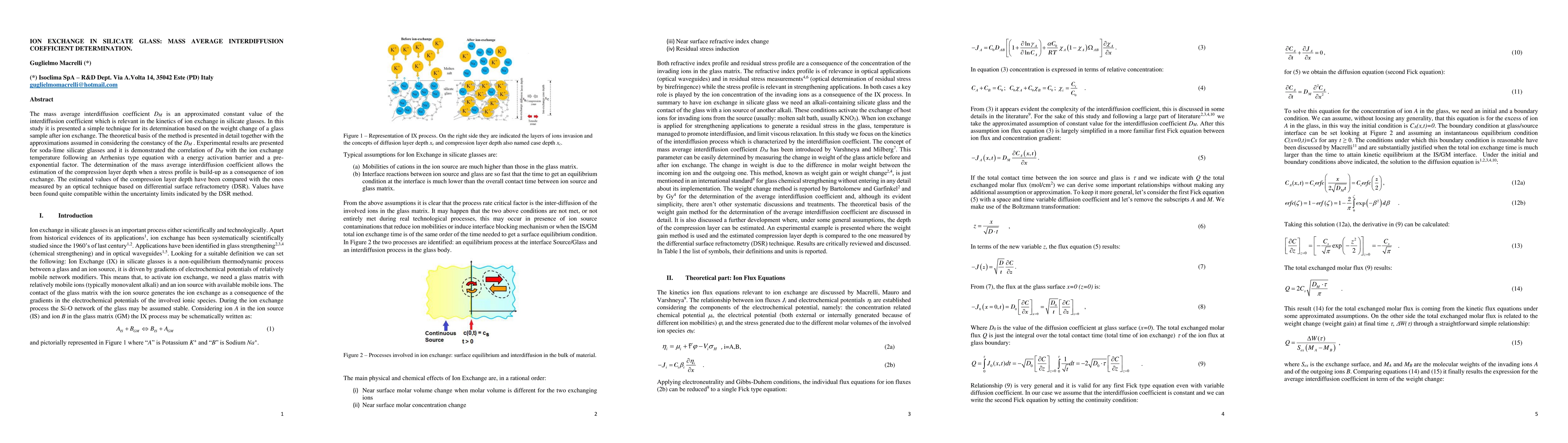 This study presents a technique for determining the mass average interdiffusion coefficient DM in silicate glasses through weight change analysis post-ion exchange. Experimental results show DM correlates with ion exchange temperature via an Arrhenius-type equation, and estimated compression layer depths from DM match those measured by differential surface refractometry.