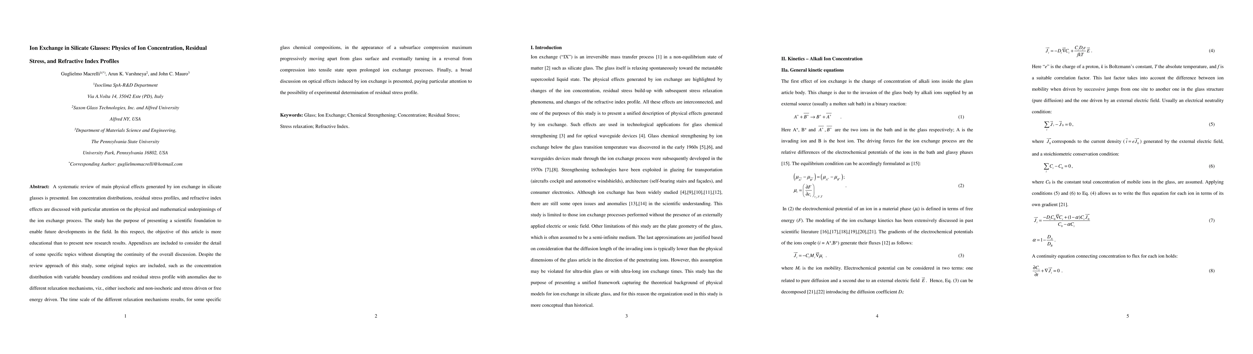 This paper systematically reviews the physical effects of ion exchange in silicate glasses, focusing on ion concentration, residual stress, and refractive index profiles. It aims to provide a scientific foundation for future advancements, discussing original topics like variable boundary conditions and subsurface stress reversals due to different relaxation mechanisms.