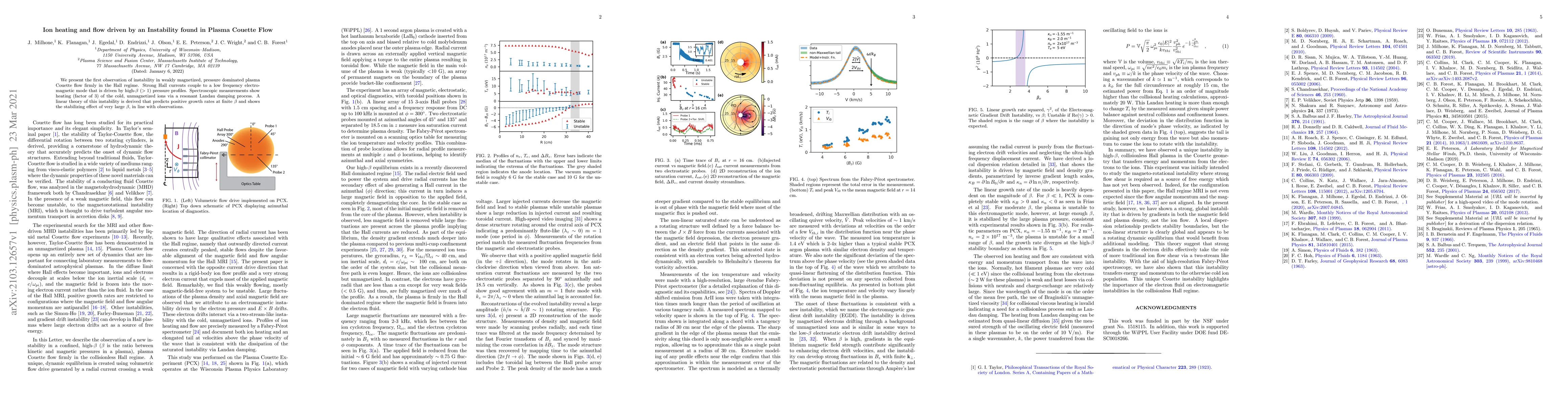 We present the first observation of instability in weakly magnetized, pressure dominated plasma Couette flow firmly in the Hall regime. Strong Hall currents couple to a low frequency electromagnetic mode that is driven by high-$\beta$ ($>1$) pressure profiles. Spectroscopic measurements show heating (factor of 3) of the cold, unmagnetized ions via a resonant Landau damping process. A linear theory of this instability is derived that predicts positive growth rates at finite $\beta$ and shows the stabilizing effect of very large $\beta$, in line with observations.