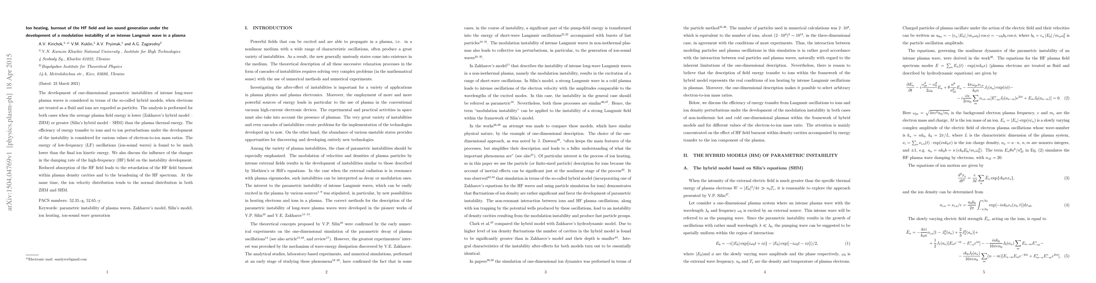 This paper investigates the parametric instabilities of intense Langmuir waves in plasmas using hybrid models, focusing on energy transfer to ions and the development of ion-sound waves. It finds that the energy of low-frequency oscillations is much lower than the ion kinetic energy, and reduced absorption of the high-frequency field delays its burnout and broadens its spectrum.