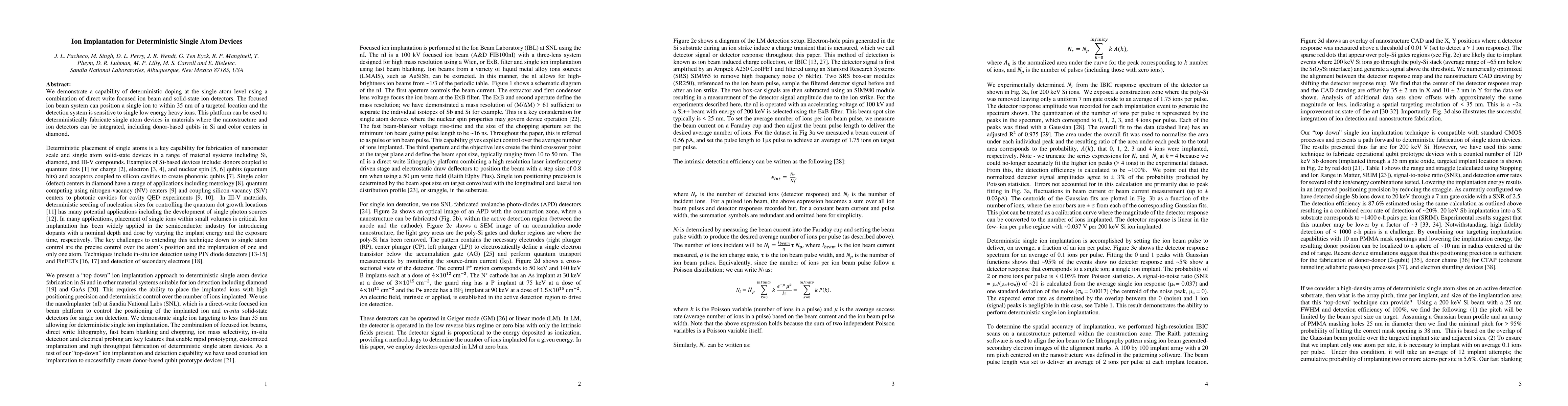 This paper presents a method for deterministic single atom doping using a focused ion beam system and solid-state ion detectors, enabling precise fabrication of single atom devices such as donor-based qubits in silicon and color centers in diamond. The technique positions ions within 35 nm accuracy and detects single low-energy heavy ions.