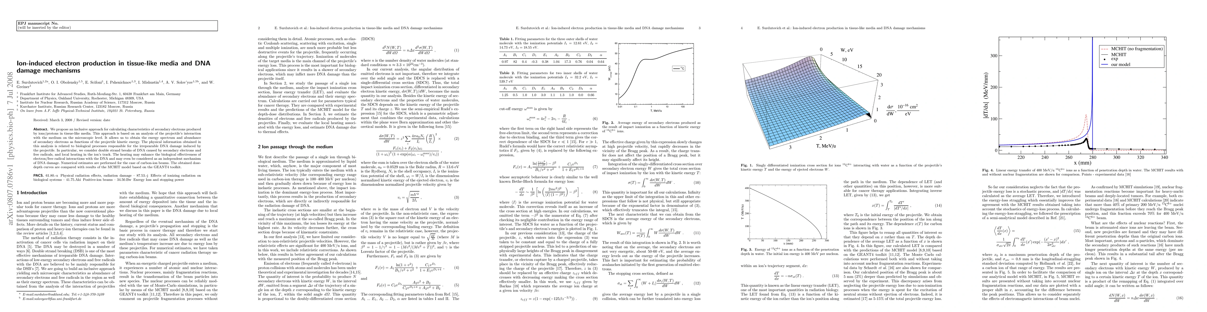 This paper proposes an inclusive method to calculate secondary electron production by ions in tissue-like media, analyzing microscopic interactions to determine energy spectra and abundances. It links these physical characteristics to biological processes, particularly DNA damage mechanisms such as double strand breaks, free radicals, and local heating effects, with numerical estimates for carbon-ion beams.