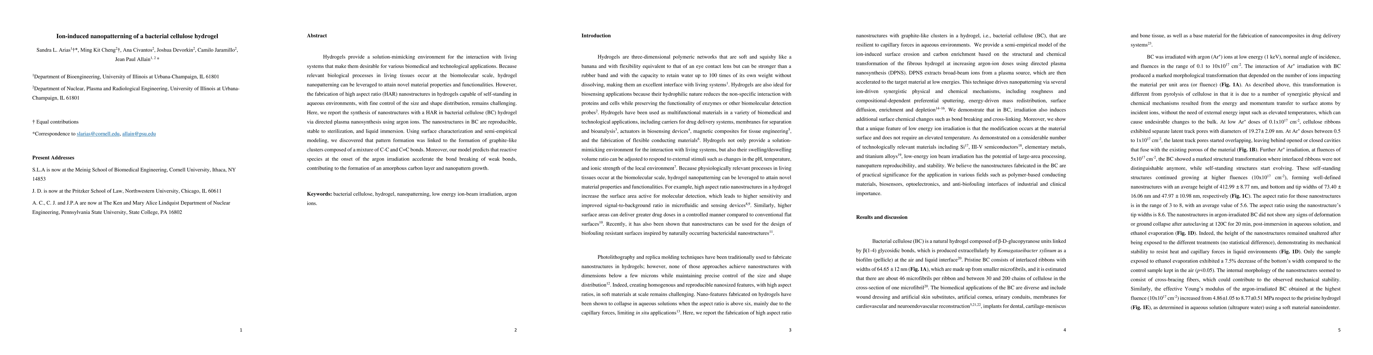 A combination of experimental and theoretical approaches was used to study the effects of low-energy ion irradiation on bacterial cellulose.