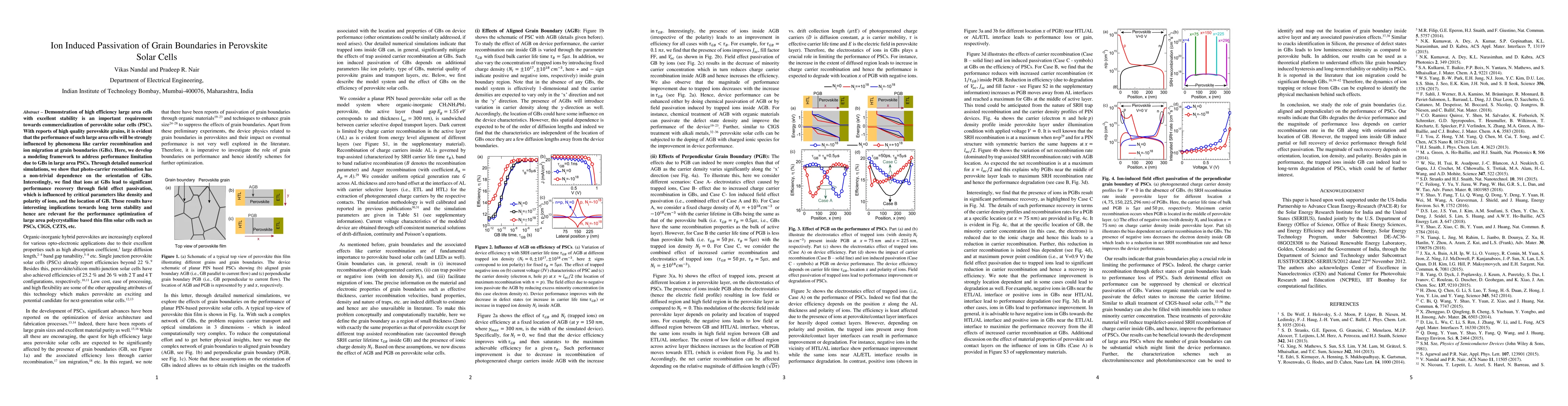 This paper develops a modeling framework to address the performance limitations of large area perovskite solar cells due to grain boundary phenomena. It finds that ion-induced passivation at grain boundaries significantly improves performance through field effect passivation, influenced by ion density, polarity, and boundary location.