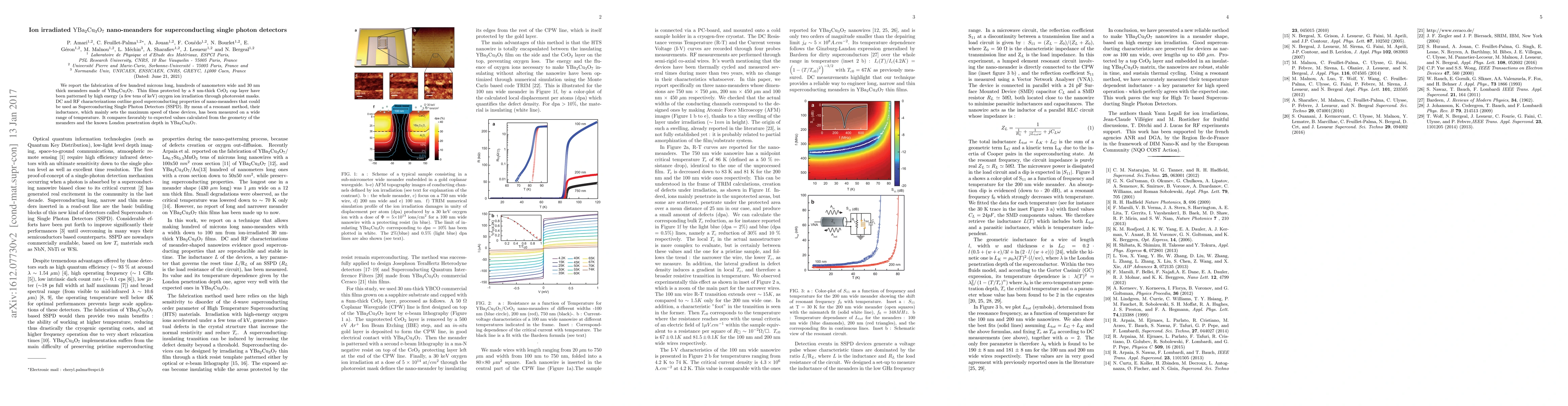 The paper details the creation of YBa2Cu3O7 nano-meanders for Superconducting Single Photon Detectors (SSPDs) using high energy ion irradiation. The nano-meanders exhibit good superconducting properties with measured inductance aligning with theoretical expectations, suggesting potential for high-speed photon detection.