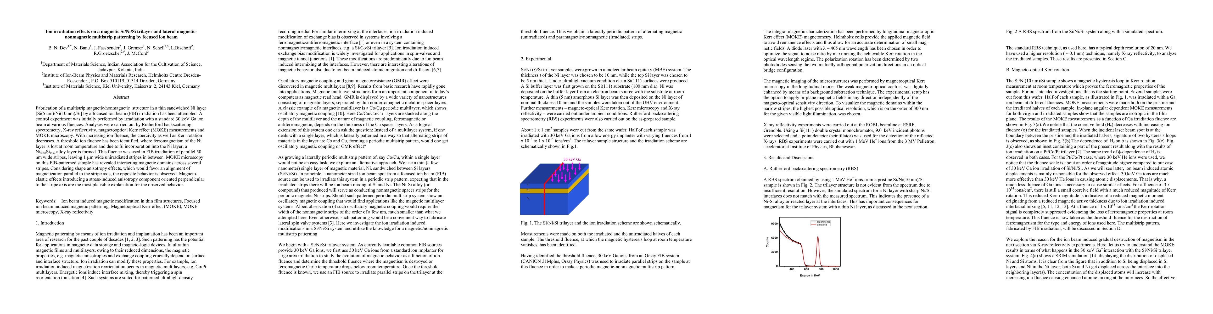 This study investigates the effects of ion irradiation on a magnetic Si/Ni/Si trilayer and the creation of lateral magnetic-nonmagnetic multistrip patterns using focused ion beam (FIB). The results show that high ion fluence leads to the loss of Ni's ferromagnetism and formation of a Ni-Si alloy, while FIB patterning reveals unexpected perpendicular magnetic domain alignment due to magneto-elastic effects.