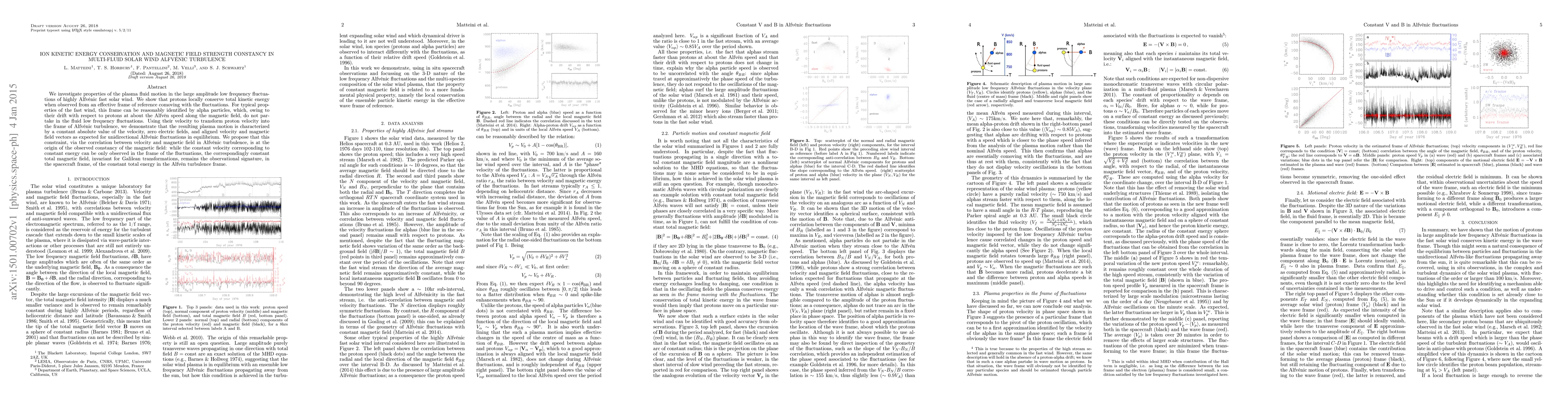 We investigate properties of the plasma fluid motion in the large amplitude low frequency fluctuations of highly Alfv\'enic fast solar wind. We show that protons locally conserve total kinetic energy when observed from an effective frame of reference comoving with the fluctuations. For typical properties of the fast wind, this frame can be reasonably identified by alpha particles, which, owing to their drift with respect to protons at about the Alfv\'en speed along the magnetic field, do not partake in the fluid low frequency fluctuations. Using their velocity to transform proton velocity into the frame of Alfv\'enic turbulence, we demonstrate that the resulting plasma motion is characterized by a constant absolute value of the velocity, zero electric fields, and aligned velocity and magnetic field vectors as expected for unidirectional Alfv\'enic fluctuations in equilibrium. We propose that this constraint, via the correlation between velocity and magnetic field in Alfv\'enic turbulence, is at the origin of the observed constancy of the magnetic field: while the constant velocity corresponding to constant energy can be only observed in the frame of the fluctuations, the correspondingly constant total magnetic field, invariant for Galilean transformations, remains the observational signature, in the spacecraft frame, of the constant total energy in the Alfv\'en turbulence frame.
