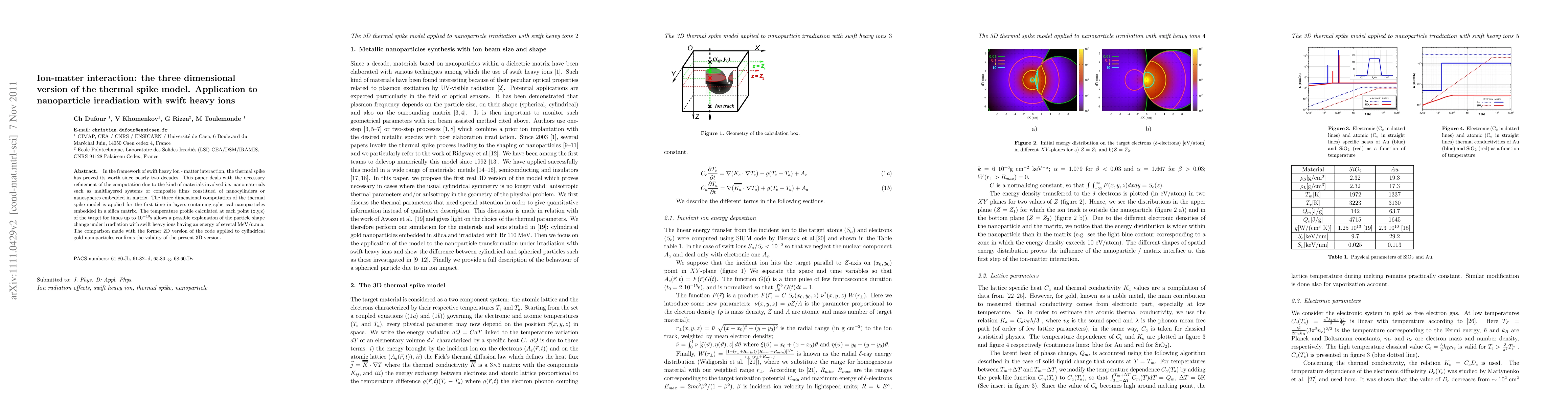 In the framework of swift heavy ion - matter interaction, the thermal spike has proved its worth since nearly two decades. This paper deals with the necessary refinement of the computation due to the kind of materials involved i.e. nanomaterials such as multilayered systems or composite films constitued of nanocylinders or nanospheres embedded in matrix. The three dimensional computation of the thermal spike model is applied for the first time in layers containing spherical nanoparticles embedded in a silica matrix. The temperature profile calculated at each point (x,y,z) of the target for times up to $10^{-10}$s allows a possible explanation of the particle shape change under irradiation with swift heavy ions having an energy of several MeV/u.m.a. The comparison made with the former 2D version of the code applied to cylindrical gold nanoparticles confirms the validity of the present 3D version.