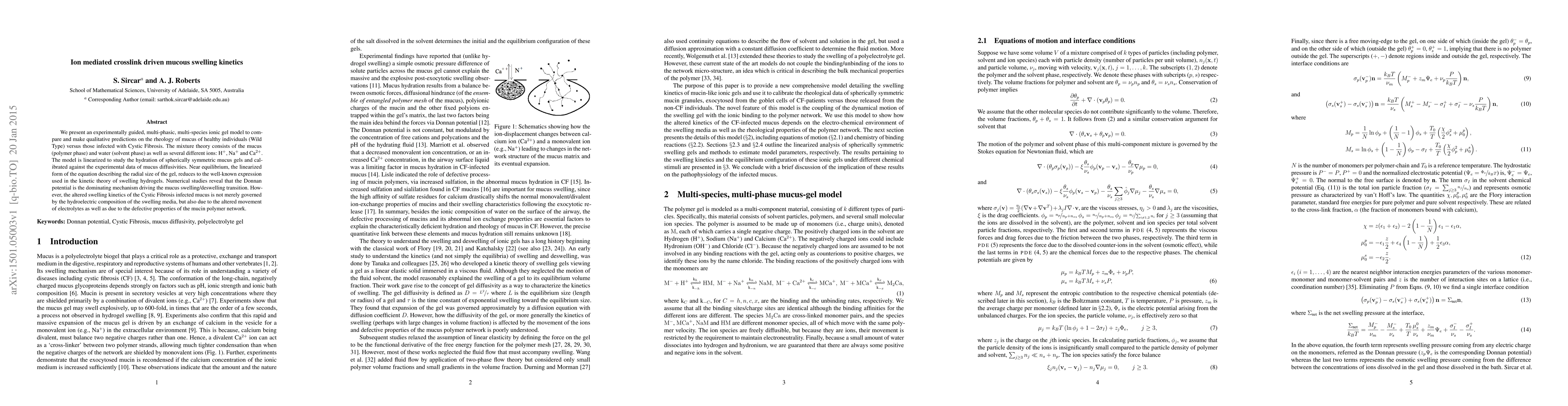 This research develops a multi-phasic ionic gel model to predict the swelling kinetics of mucus, comparing healthy individuals to those with Cystic Fibrosis. The model reveals that the Donnan potential primarily drives mucus swelling, but altered electrolyte movement and defective mucin networks also affect Cystic Fibrosis mucus.