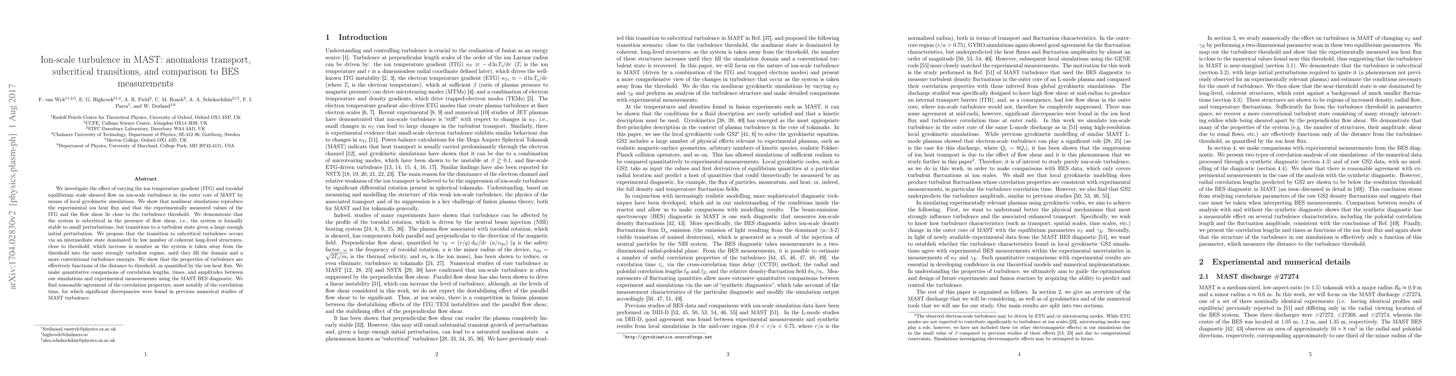 This paper investigates ion-scale turbulence in MAST, showing that nonlinear gyrokinetic simulations reproduce experimental ion heat flux. It demonstrates subcritical transitions to turbulence via intermediate states dominated by coherent structures, and finds reasonable agreement between simulation and experimental measurements using BES diagnostics.