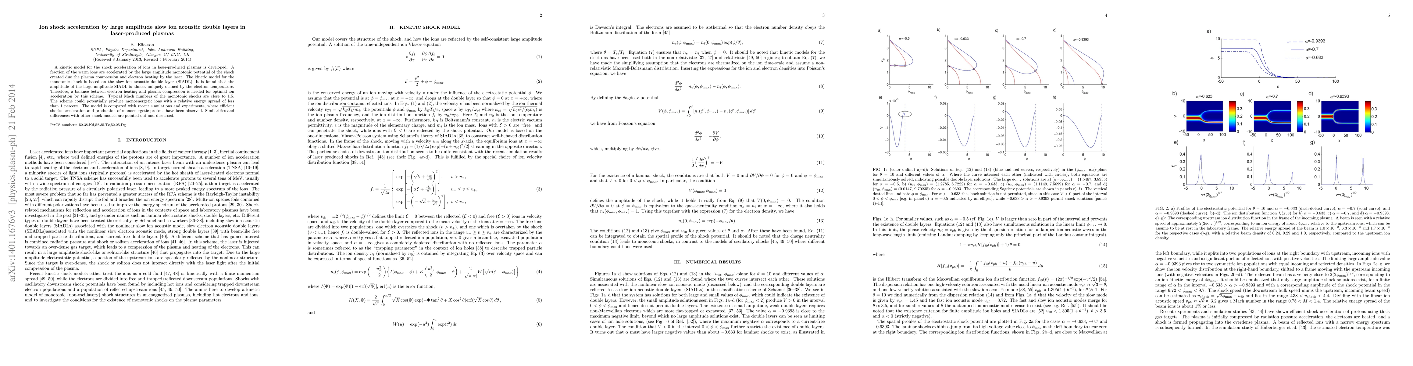 This paper develops a kinetic model for ion shock acceleration in laser-produced plasmas, showing that large amplitude double layers, defined by electron temperature, can efficiently accelerate ions. The model predicts monoenergetic ions with minimal energy spread and compares well with recent experimental and simulation results.
