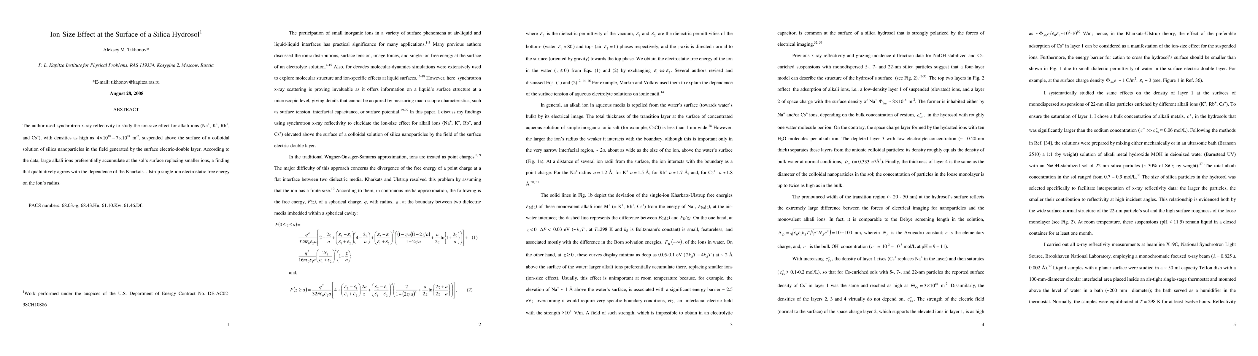 The author used synchrotron x-ray reflectivity to study the ion-size effect for alkali ions (Na$^+$, K$^+$, Rb$^+$, and Cs$^+$), with densities as high as $4 \times 10^{18}- 7 \times 10^{18}$ m$^{-2}$, suspended above the surface of a colloidal solution of silica nanoparticles in the field generated by the surface electric-double layer. According to the data, large alkali ions preferentially accumulate at the sol's surface replacing smaller ions, a finding that qualitatively agrees with the dependence of the Kharkats-Ulstrup single-ion electrostatic free energy on the ion's radius.