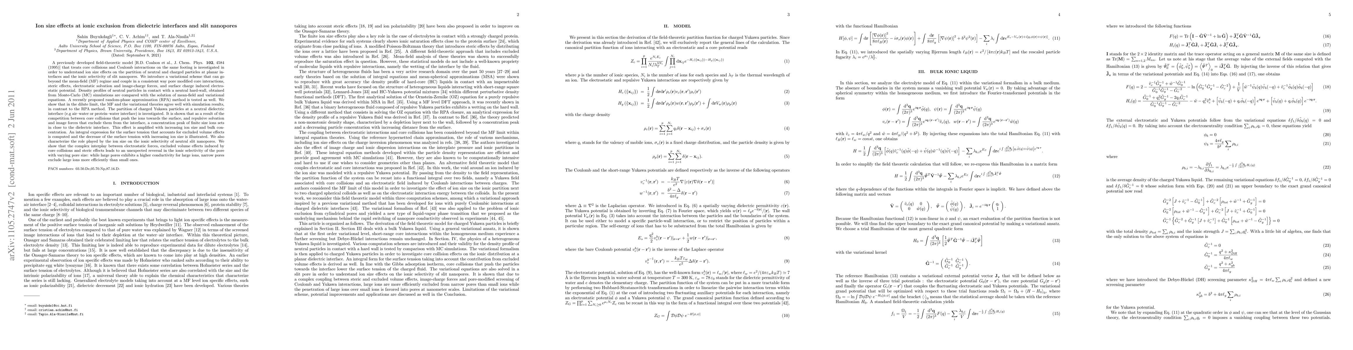 A previously developed field-theoretic model [R.D. Coalson et al., J. Chem. Phys. 102, 4584 (1995)] that treats core collisions and Coulomb interactions on the same footing is investigated in order to understand ion size effects on the partition of neutral and charged particles at planar interfaces and the ionic selectivity of slit nanopores. We introduce a variational scheme that can go beyond the mean-field (MF) regime and couple in a consistent way pore modified core interactions, steric effects, electrostatic solvation and image-charge forces, and surface charge induced electrostatic potential. We show that in the dilute limit, the MF and the variational theories agree well with MC simulation results, in contrast to a recent RPA method. The partition of charged Yukawa particles at a neutral dielectric interface (e.g air-water or protein-water interface) is investigated. It is shown that as a result of the competition between core collisions that push the ions towards the surface, and repulsive solvation and image forces that exclude them from the interface, a concentration peak of finite size ions sets in close to the dielectric interface. We also characterize the role played by the ion size on the ionic selectivity of neutral slit nanopores. We show that the complex interplay between electrostatic forces, excluded volume effects induced by core collisions and steric effects leads to an unexpected reversal in the ionic selectivity of the pore with varying pore size: while large pores exhibits a higher conductivity for large ions, narrow pores exclude large ions more efficiently than small ones.