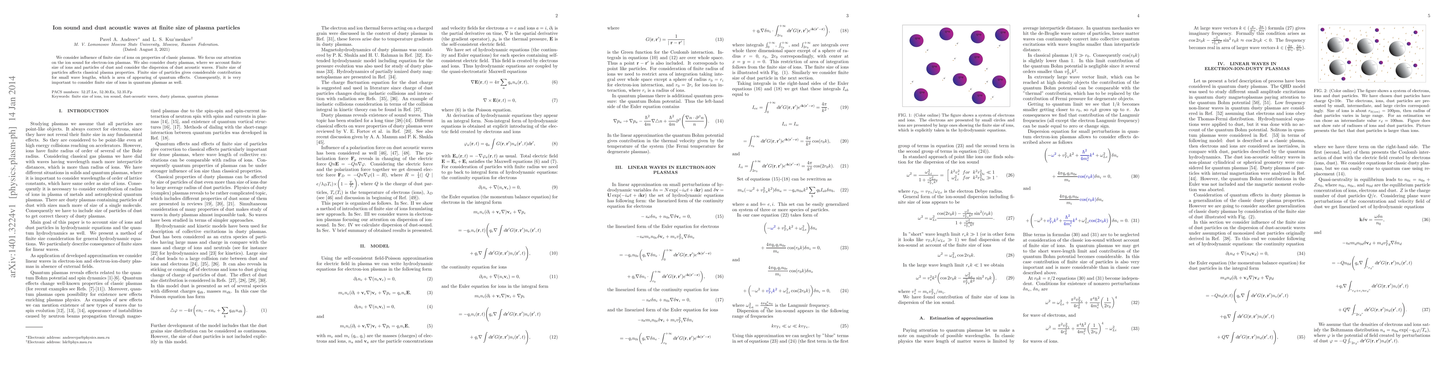 We consider influence of finite size of ions on properties of classic plasmas. We focus our attention on the ion sound for electron-ion plasmas. We also consider dusty plasmas, where we account finite size of ions and particles of dust and consider the dispersion of dust acoustic waves. Finite size of particles affects classical plasma properties. Finite size of particles gives considerable contribution for small wave lengths, which is area of appearing of quantum effects. Consequently, it is very important to consider finite size of ions in quantum plasmas as well.