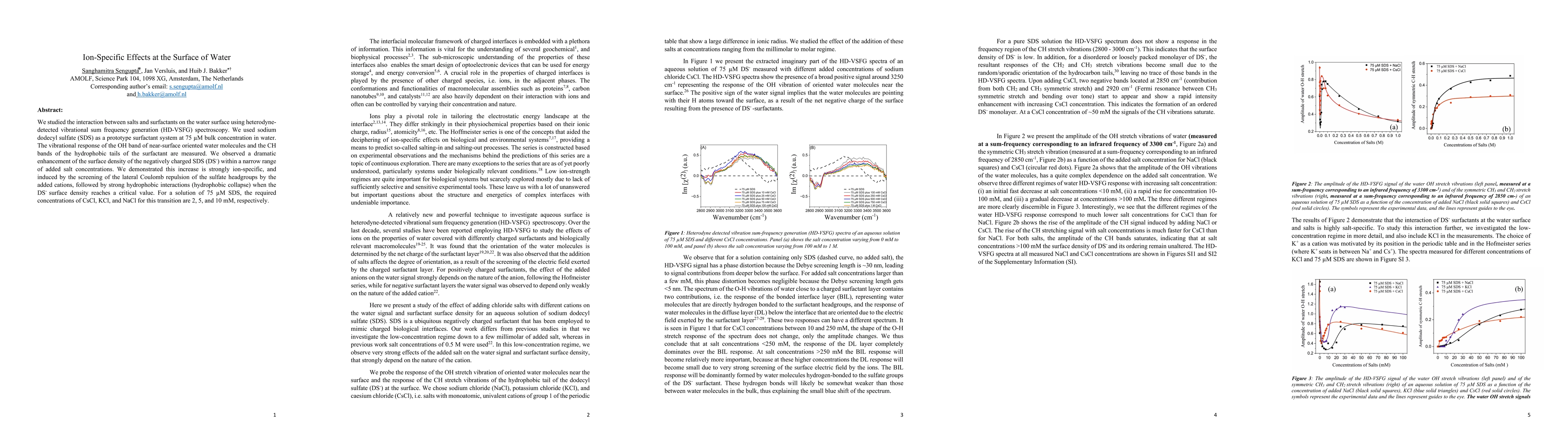 We studied the interaction between salts and surfactants on the water surface using heterodyne-detected vibrational sum frequency generation (HD-VSFG) spectroscopy. We used sodium dodecyl sulfate (SDS) as a prototype surfactant system at 75 micromolar bulk concentration in water. The vibrational response of the OH band of near-surface oriented water molecules and the CH bands of the hydrophobic tails of the surfactant are measured. We observed a dramatic enhancement of the surface density of the negatively charged SDS (DS-) within a narrow range of added salt concentrations. We demonstrated this increase is strongly ion-specific, and induced by the screening of the lateral Coulomb repulsion of the sulfate headgroups by the added cations, followed by strong hydrophobic interactions (hydrophobic collapse) when the DS- surface density reaches a critical value. For a solution of 75 micromolar SDS, the required concentrations of CsCl, KCl, and NaCl for this transition are 2, 5, and 10 mM, respectively.