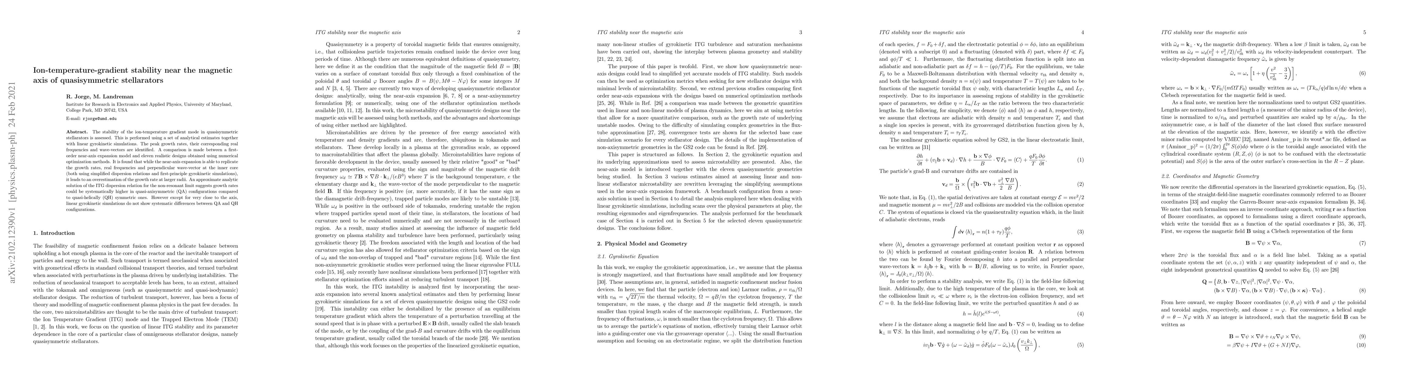 This paper assesses the stability of ion-temperature-gradient modes in quasisymmetric stellarators using analytical estimates and linear gyrokinetic simulations, finding that while near-axis expansions replicate core growth rates, they overestimate them at larger radii. The study suggests quasi-axisymmetric configurations may have higher growth rates, but simulations show no systematic differences between quasi-axisymmetric and quasi-helically symmetric designs.