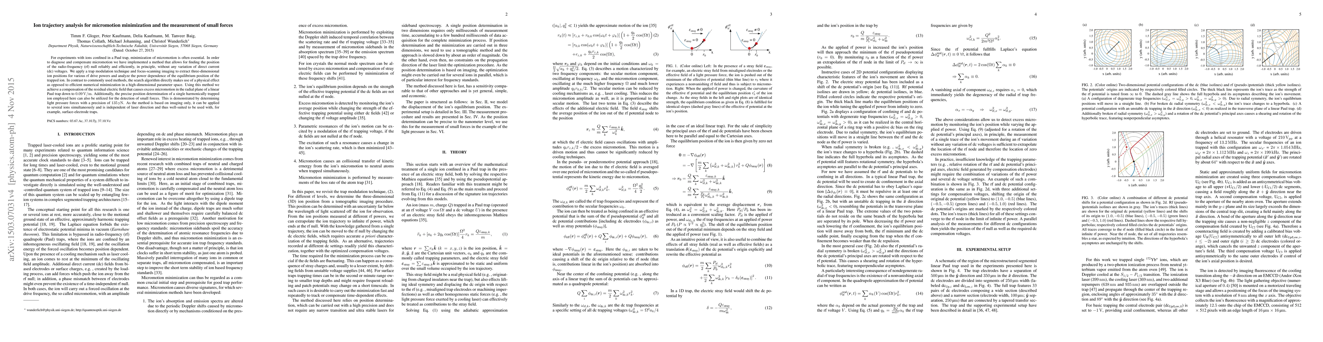 This paper presents a method for minimizing micromotion in ion traps by identifying the radio-frequency null position efficiently without altering direct current voltages. The technique employs trap modulation and focus-scanning imaging to detect small forces, achieving a residual electric field compensation down to 0.09V/m and detecting light pressure forces with a precision of 135yN.