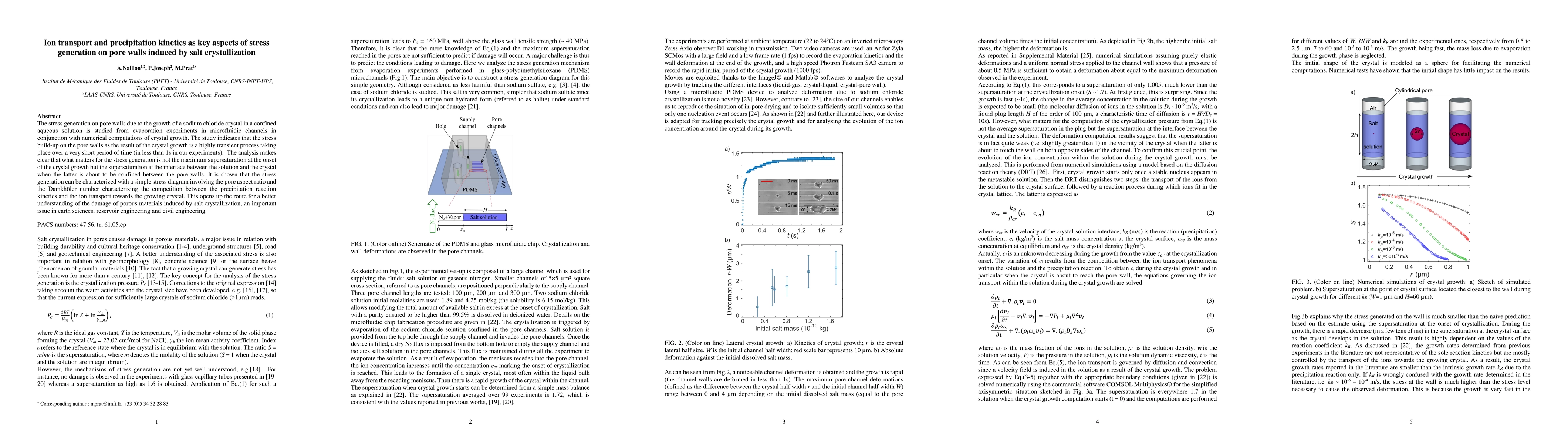 This paper investigates the transient stress generation on pore walls due to sodium chloride crystal growth in confined aqueous solutions, revealing that stress is primarily driven by supersaturation at the interface rather than initial conditions. A stress diagram based on pore aspect ratio and the Damköhler number aids in understanding damage from salt crystallization in various engineering fields.