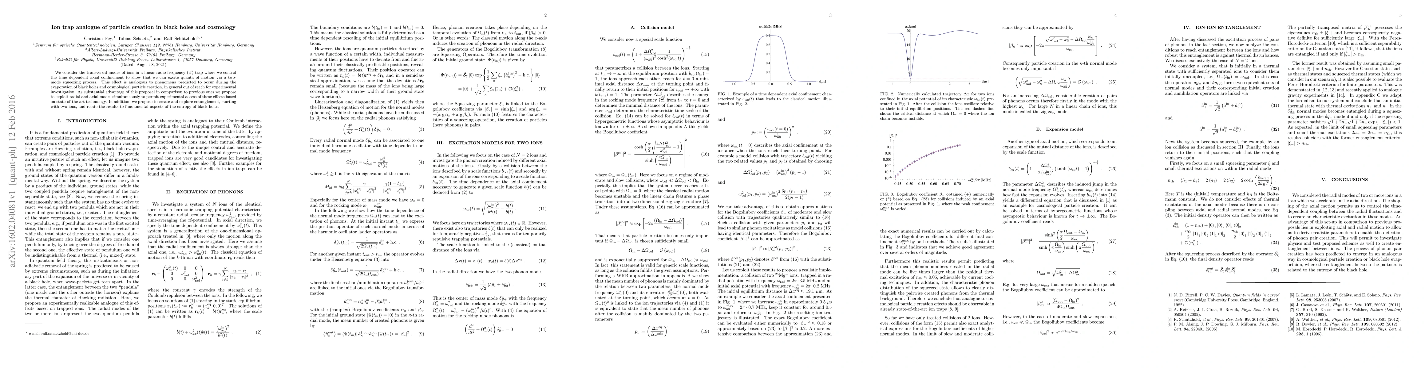 We consider the transversal modes of ions in a linear radio frequency (rf) trap where we control the time dependent axial confinement to show that we can excite quanta of motion via a two-mode squeezing process. This effect is analogous to phenomena predicted to occur during the evaporation of black holes and cosmological particle creation, in general out of reach for experimental investigation. As substantial advantage of this proposal in comparison to previous ones we propose to exploit radial and axial modes simultaneously to permit experimental access of these effects based on state-of-the-art technology. In addition, we propose to create and explore entanglement, starting with two ions, and relate the results to fundamental aspects of the entropy of black holes.