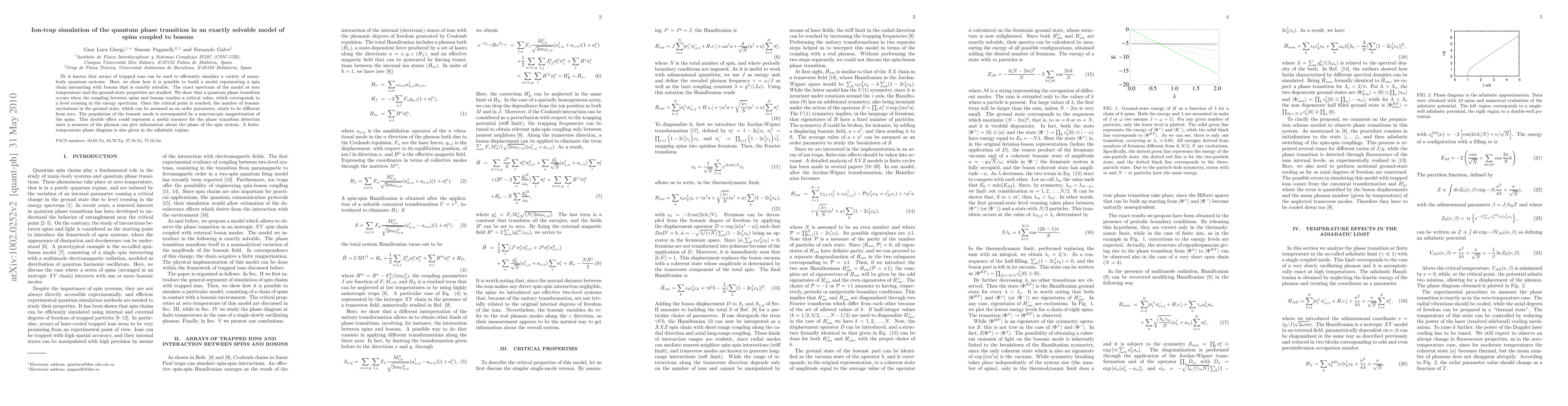 It is known that arrays of trapped ions can be used to efficiently simulate a variety of many-body quantum systems. Here, we show how it is possible to build a model representing a spin chain interacting with bosons which is exactly solvable. The exact spectrum of the model at zero temperature and the ground state properties are studied. We show that a quantum phase transition occurs when the coupling between spins and bosons reaches a critical value, which corresponds to a level crossing in the energy spectrum. Once the critical point is reached, the number of bosonic excitations in the ground state, which can be assumed as an order parameter, starts to be different from zero. The population of the bosonic mode is accompanied by a macroscopic magnetization of the spins. This double effect could represent an useful resource for the phase transition detection since a measure on the phonon can give information about the phase of the spin system. A finite temperature phase diagram is also given in the adiabatic regime.