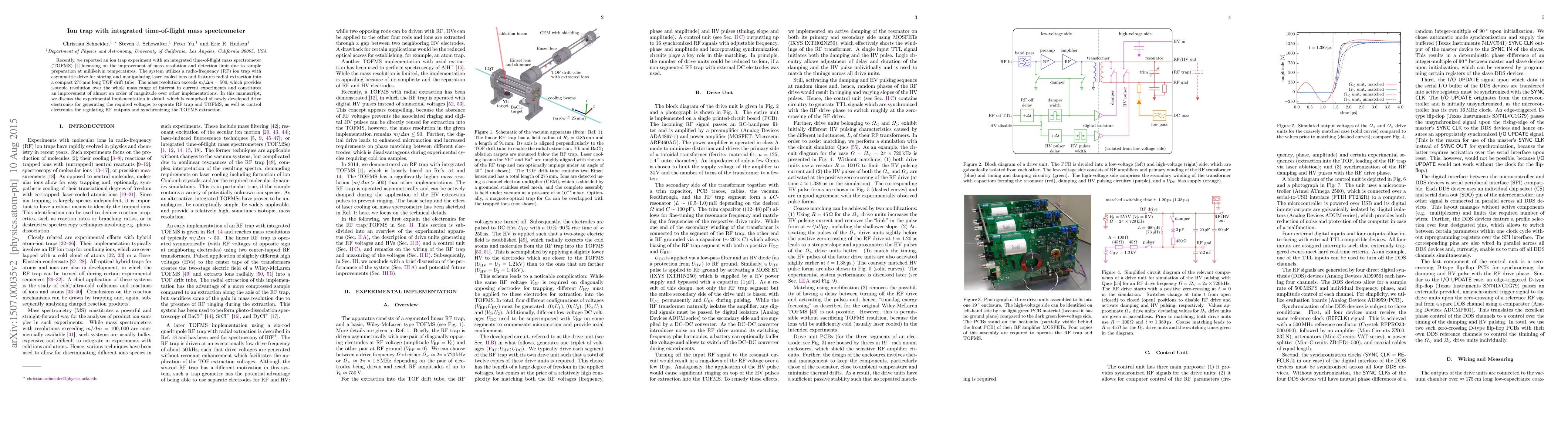 Recently, we reported an ion trap experiment with an integrated time-of-flight mass spectrometer (TOFMS) [Phys. Rev. Appl. 2, 034013 (2014)] focussing on the improvement of mass resolution and detection limit due to sample preparation at millikelvin temperatures. The system utilizes a radio-frequency (RF) ion trap with asymmetric drive for storing and manipulating laser-cooled ions and features radial extraction into a compact $275$ mm long TOF drift tube. The mass resolution exceeds $m / \Delta m = 500$, which provides isotopic resolution over the whole mass range of interest in current experiments and constitutes an improvement of almost an order of magnitude over other implementations. In this manuscript, we discuss the experimental implementation in detail, which is comprised of newly developed drive electronics for generating the required voltages to operate RF trap and TOFMS, as well as control electronics for regulating RF outputs and synchronizing the TOFMS extraction.
